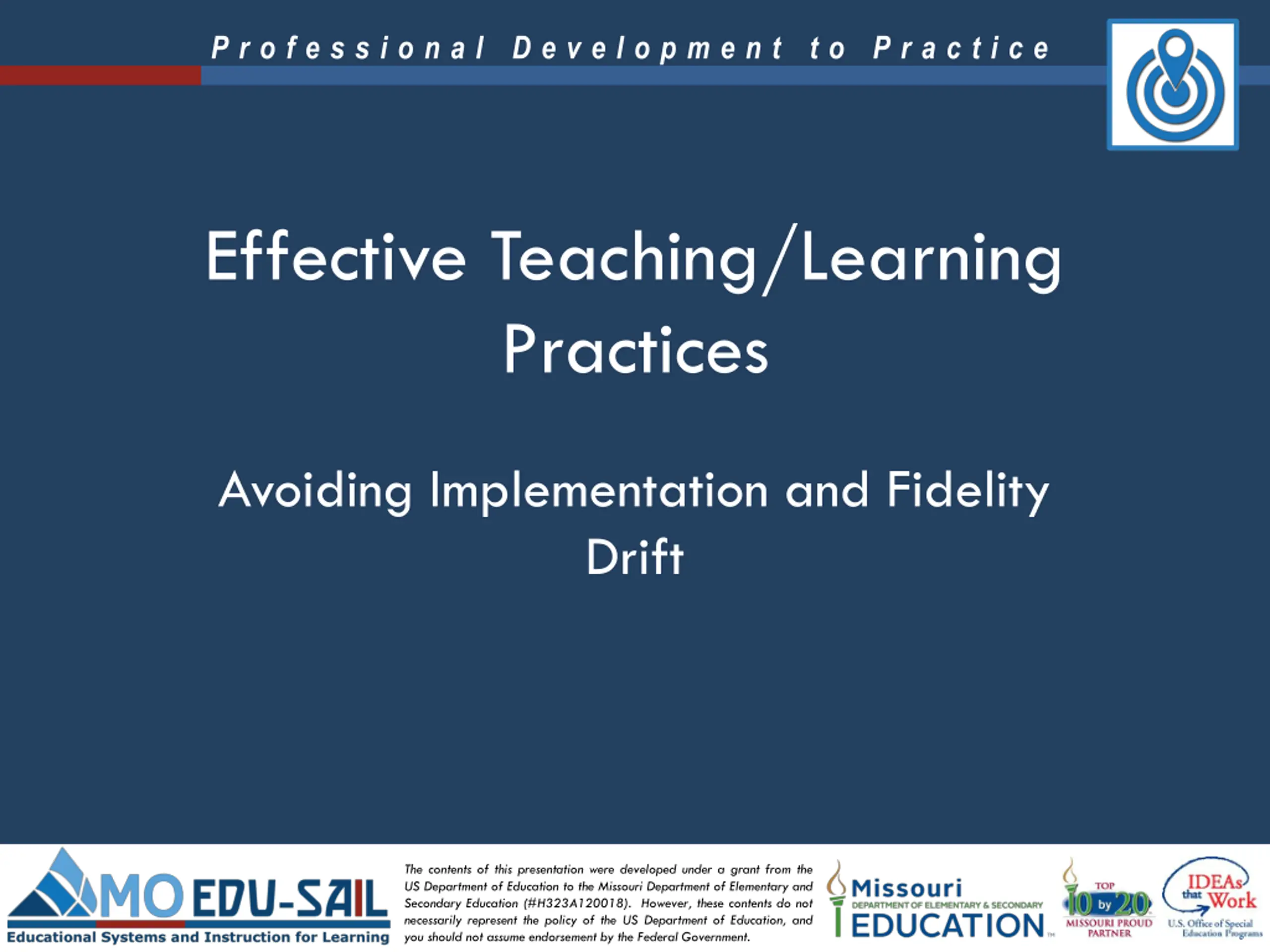 P r o f e s s i o n a l D e v e l o p m e n t t o P r a c t i c e P r o f e s s i o n a l D e v e l o p m e n t t o P r a c t i c e Effective Teaching/Learning Practices Avoiding Implementation and Fidelity Drift The contents of this presentation were developed under a grant from the US Department of Education to the Missouri Department of Elementary and Secondary Education (#H323A120018). However, these contents do not necessarily represent the policy of the US Department of Education, and you should not assume endorsement by the Federal Government.