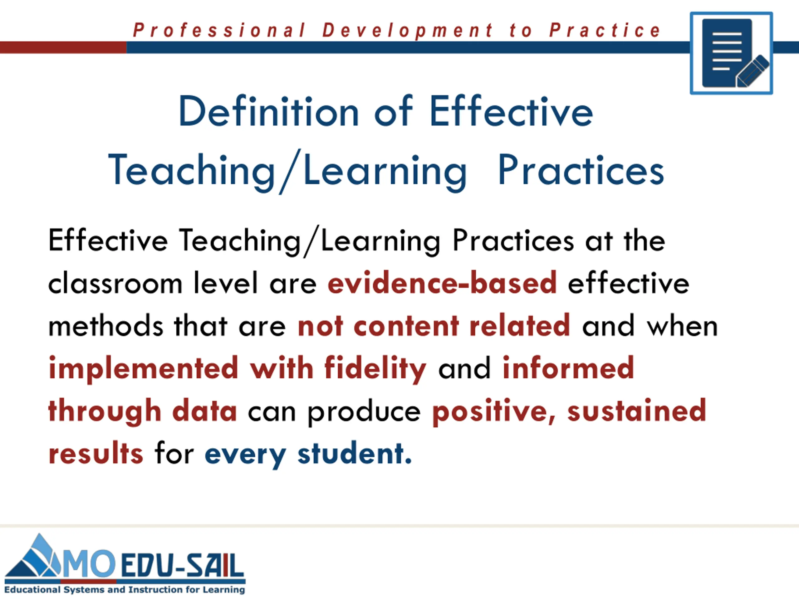 P r o f e s s i o n a l D e v e l o p m e n t t o P r a c t i c e Definition of Effective Teaching/Learning Practices Effective Teaching/Learning Practices at the classroom level are evidence-based effective methods that are not content related and when implemented with fidelity and informed through data can produce positive, sustained results for every student.