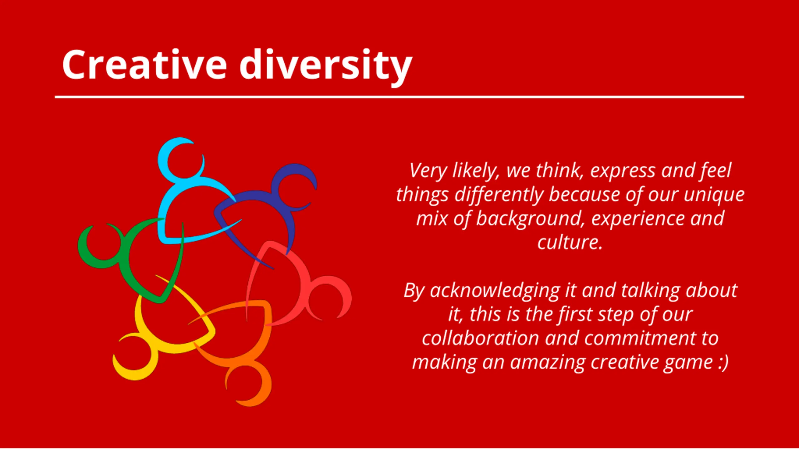 Creative diversity Very likely, we think, express and feel things differently because of our unique mix of background, experience and culture. By acknowledging it and talking about it, this is the first step of our collaboration and commitment to making an amazing creative game :)