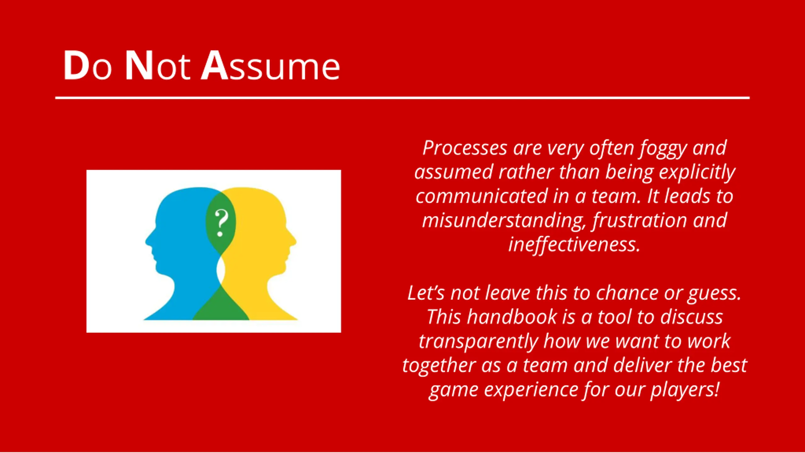 Do Not Assume Processes are very often foggy and assumed rather than being explicitly communicated in a team. It leads to misunderstanding, frustration and ineffectiveness. Let s not leave this to chance or guess. This handbook is a tool to discuss transparently how we want to work together as a team and deliver the best game experience for our players!