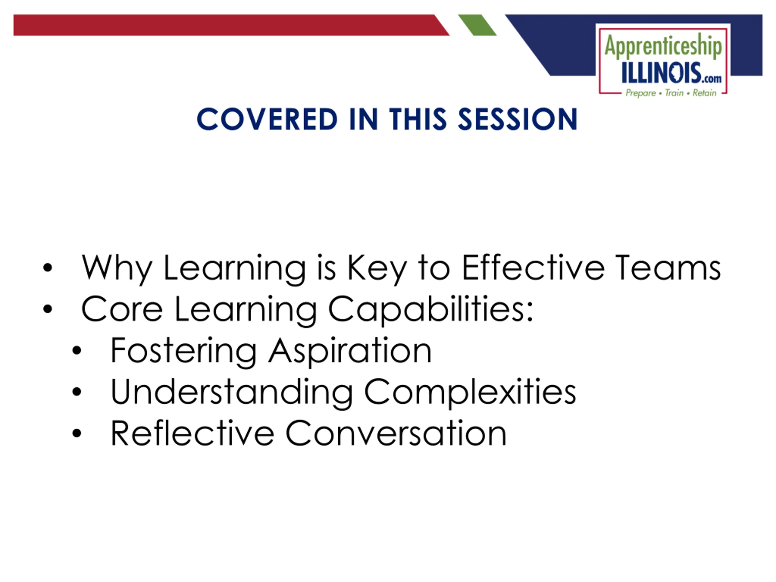 COVERED IN THIS SESSION Why Learning is Key to Effective Teams Core Learning Capabilities: Fostering Aspiration Understanding Complexities Reflective Conversation