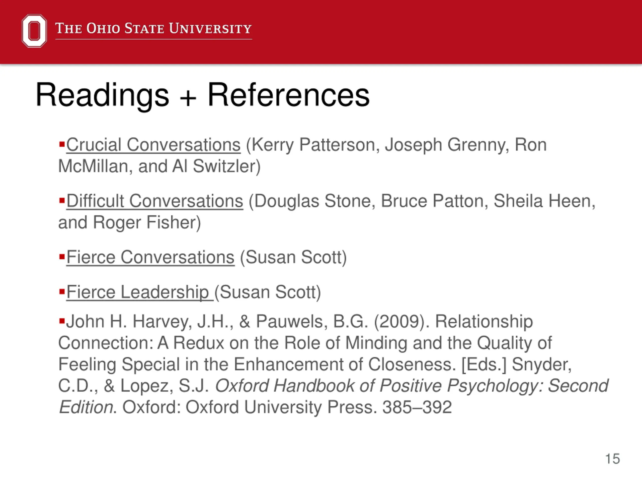 Readings + References Crucial Conversations (Kerry Patterson, Joseph Grenny, Ron McMillan, and Al Switzler) Difficult Conversations (Douglas Stone, Bruce Patton, Sheila Heen, and Roger Fisher) Fierce Conversations (Susan Scott) Fierce Leadership (Susan Scott) John H. Harvey, J.H., & Pauwels, B.G. (2009). Relationship Connection: A Redux on the Role of Minding and the Quality of Feeling Special in the Enhancement of Closeness. [Eds.] Snyder, C.D., & Lopez, S.J. Oxford Handbook of Positive Psychology: Second Edition. Oxford: Oxford University Press. 385 392 15