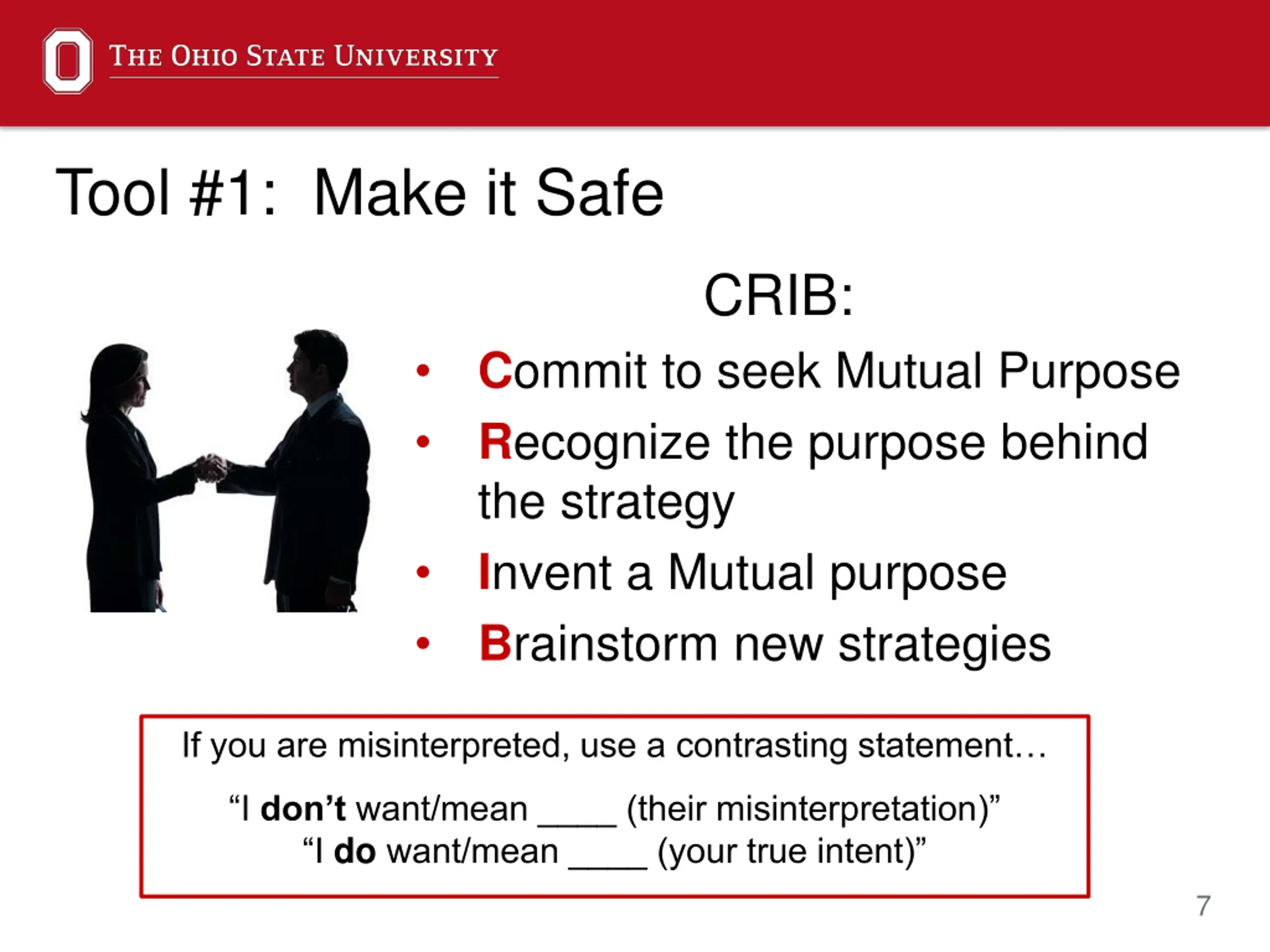 Tool #1: Make it Safe CRIB: Commit to seek Mutual Purpose Recognize the purpose behind the strategy Invent a Mutual purpose Brainstorm new strategies If you are misinterpreted, use a contrasting statement I don twant/mean ____ (their misinterpretation) I dowant/mean ____ (your true intent) 7