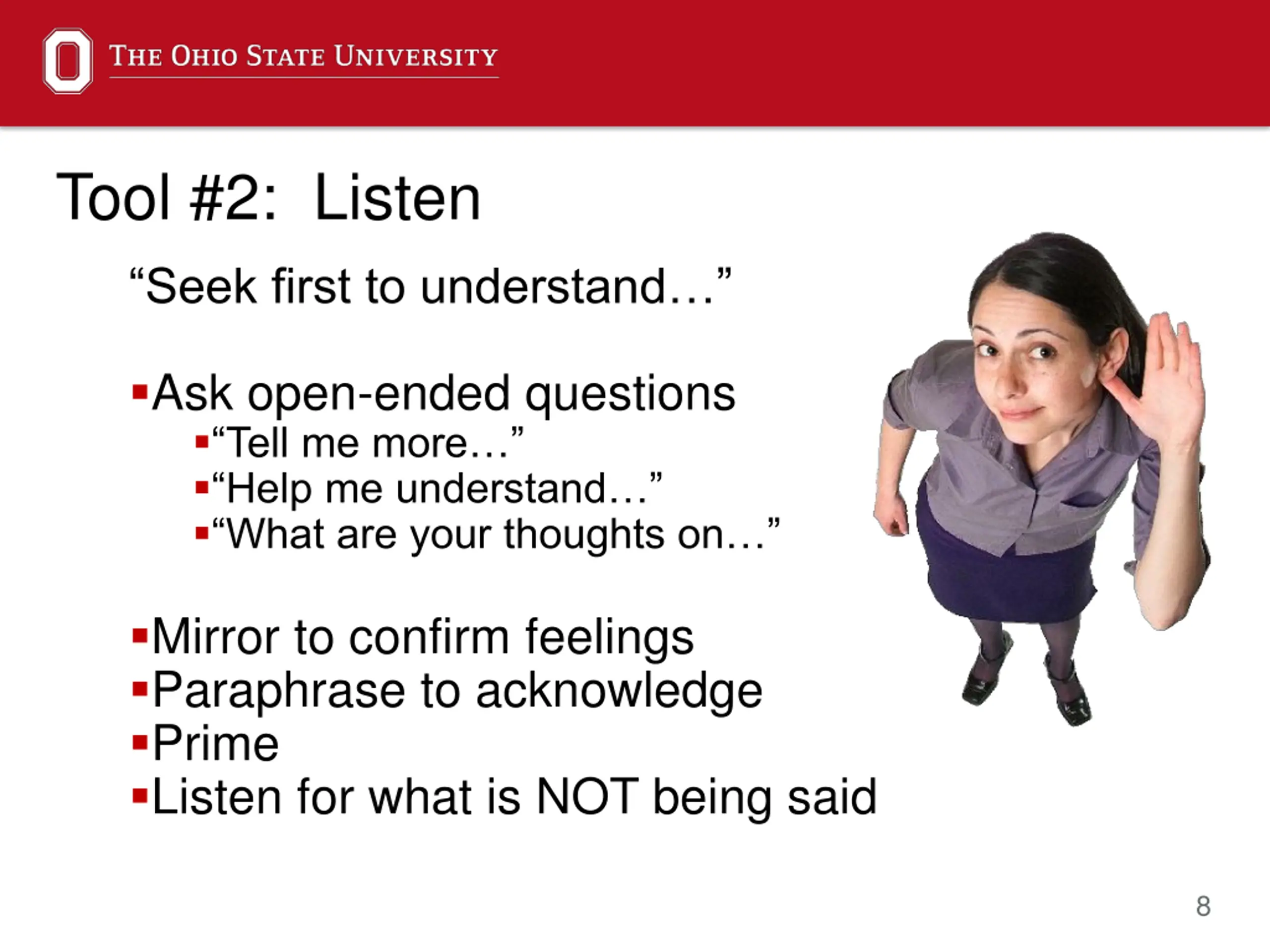Tool #2: Listen Seek first to understand Ask open-ended questions Tell me more Help me understand What are your thoughts on Mirror to confirm feelings Paraphrase to acknowledge Prime Listen for what is NOT being said 8