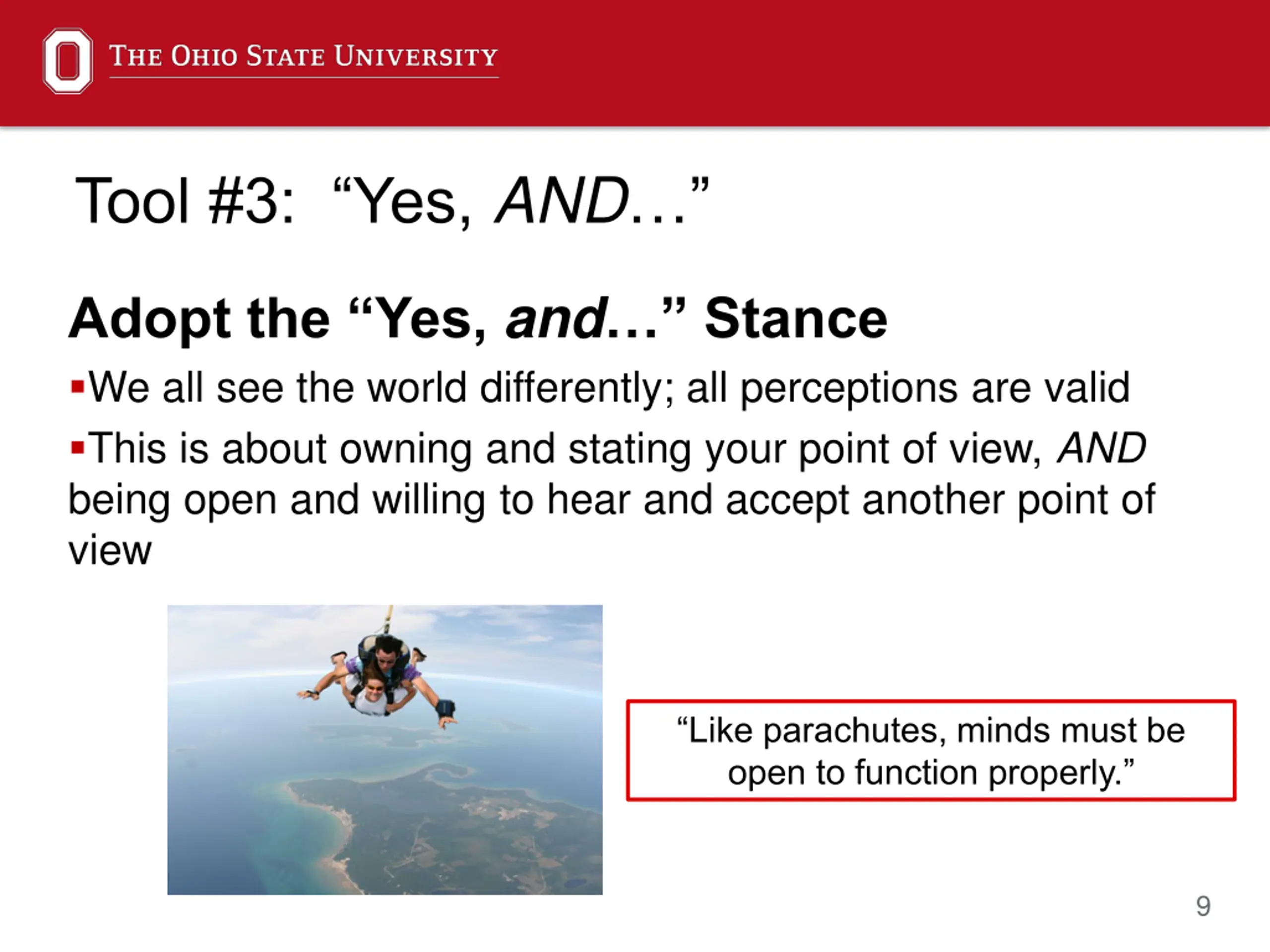 Tool #3: Yes, AND Adopt the Yes, and Stance We all see the world differently; all perceptions are valid This is about owning and stating your point of view, AND being open and willing to hear and accept another point of view Like parachutes, minds must be open to function properly. 9