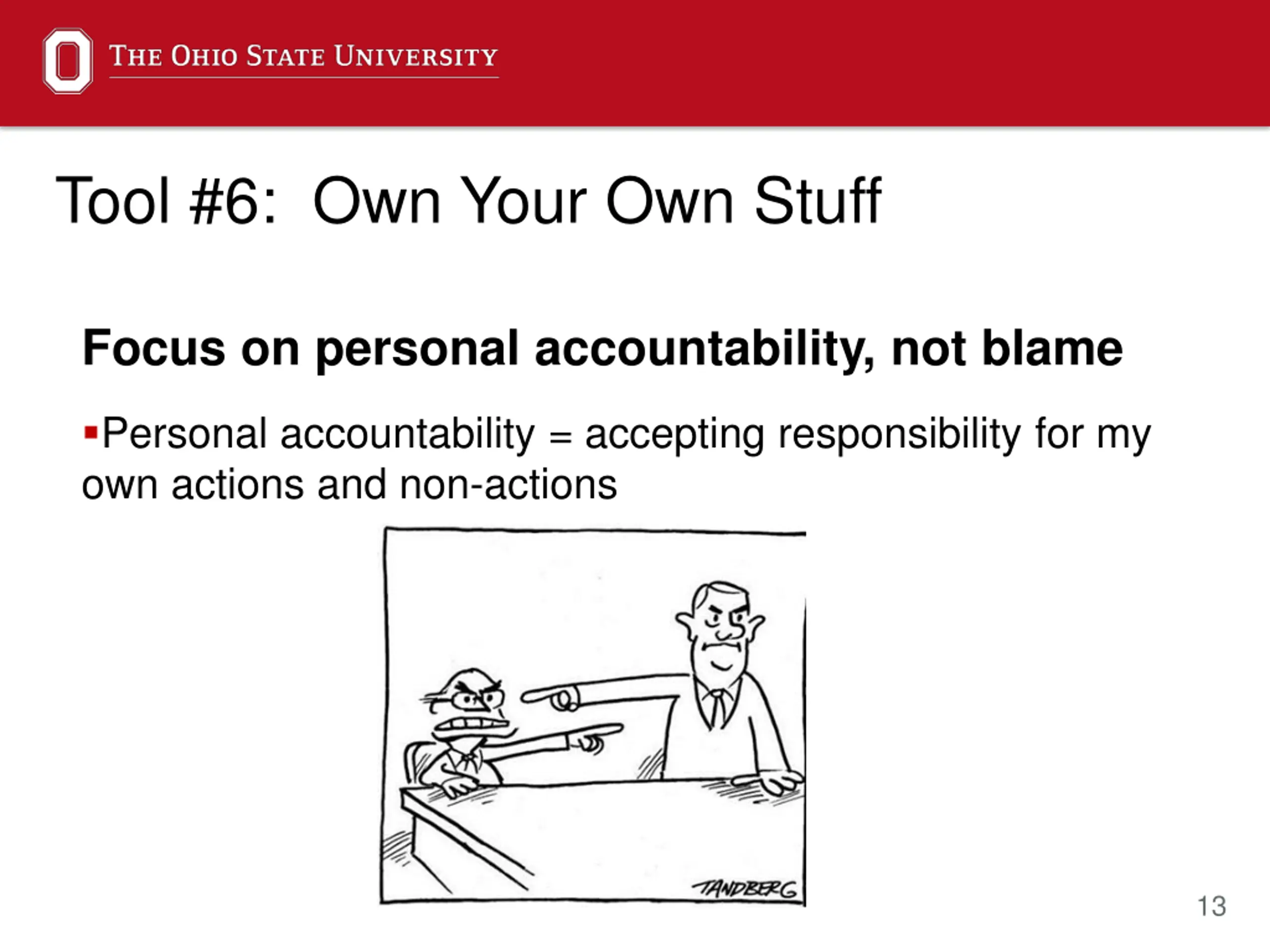 Tool #6: Own Your Own Stuff Focus on personal accountability, not blame Personal accountability = accepting responsibility for my own actions and non-actions 13