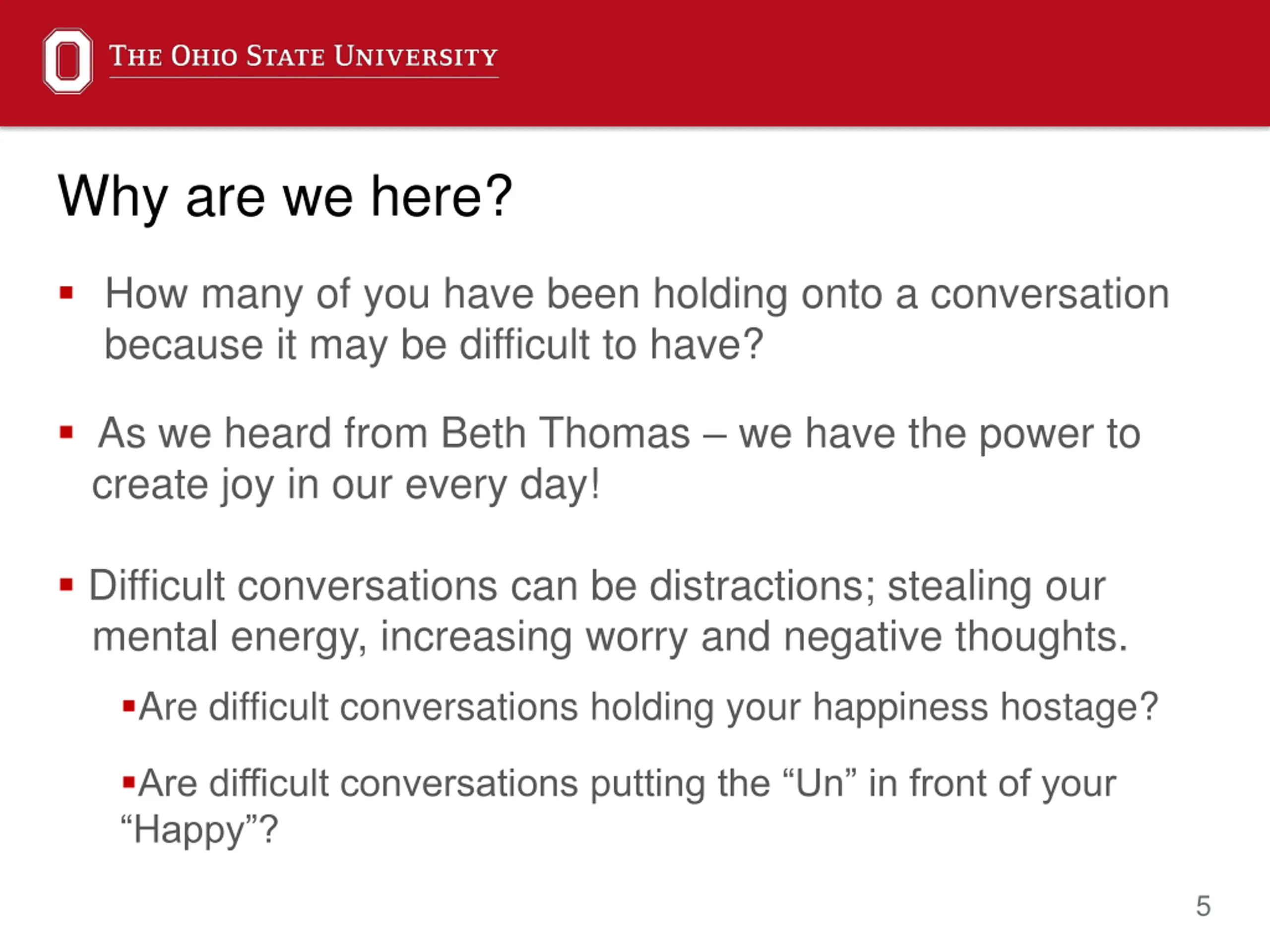 Why are we here? How many of you have been holding onto a conversation because it may be difficult to have? As we heard from Beth Thomas we have the power to create joy in our every day! Difficult conversations can be distractions; stealing our mental energy, increasing worry and negative thoughts. Are difficult conversations holding your happiness hostage? Are difficult conversations putting the Un in front of your Happy ? 5
