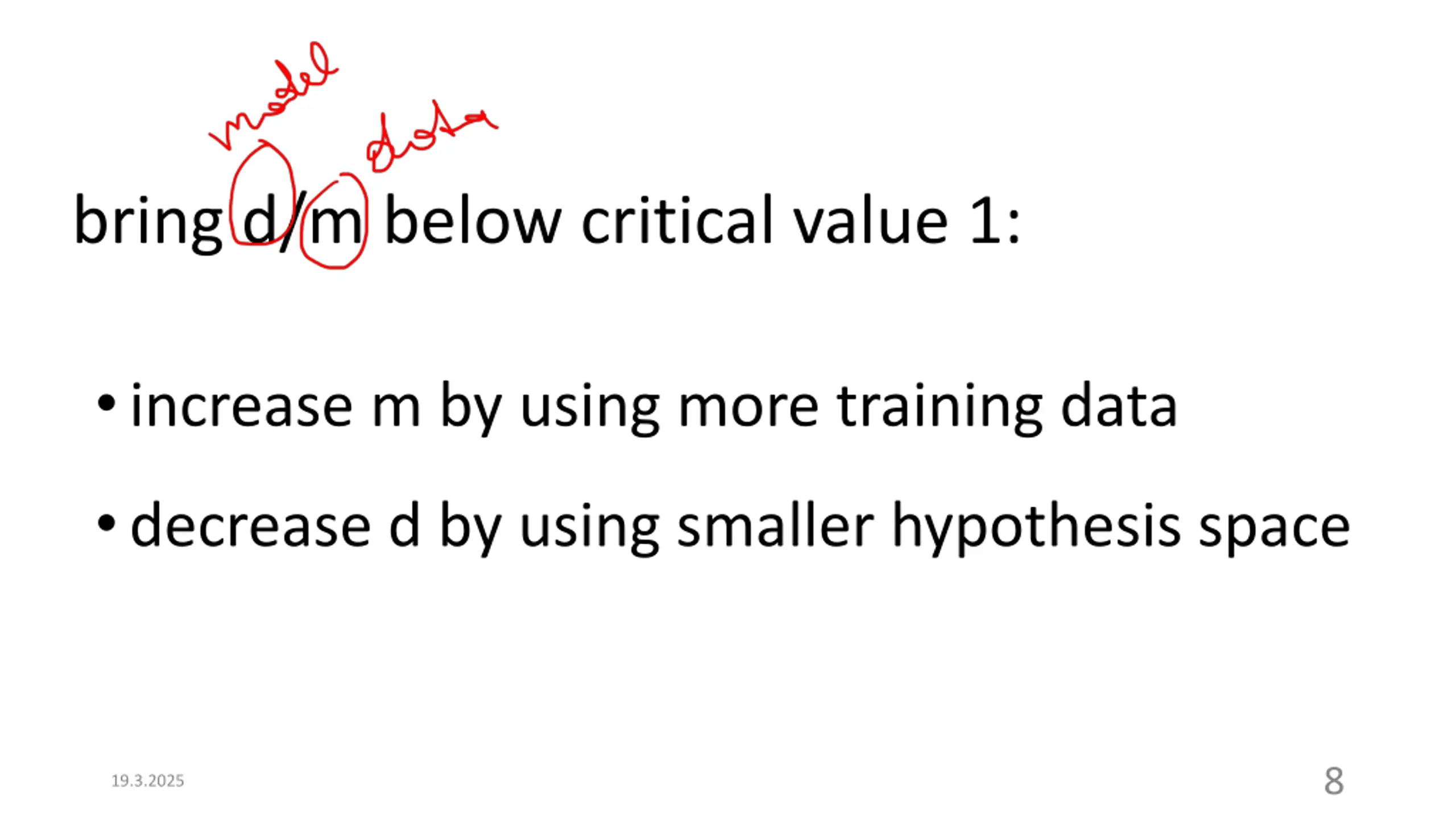 bring d/m below critical value 1: increase m by using more training data decrease d by using smaller hypothesis space 8 19.3.2025