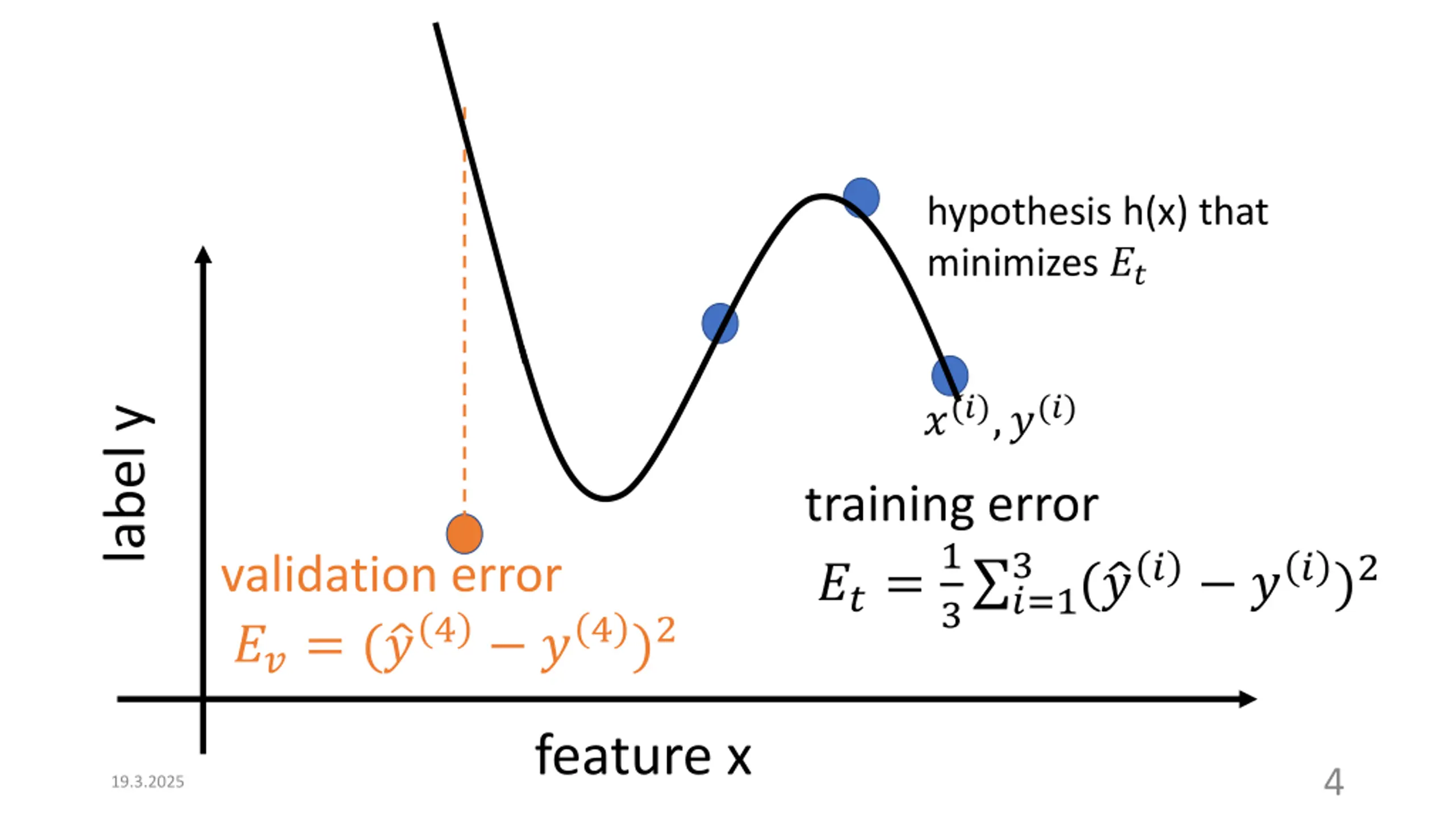 hypothesis h(x) that minimizes ?? ?(?),?(?) label y training error ??=1 3 ( ?? ??)2 validation error ??= ( ?4 ?4)2 3 ?=1 feature x 4 19.3.2025