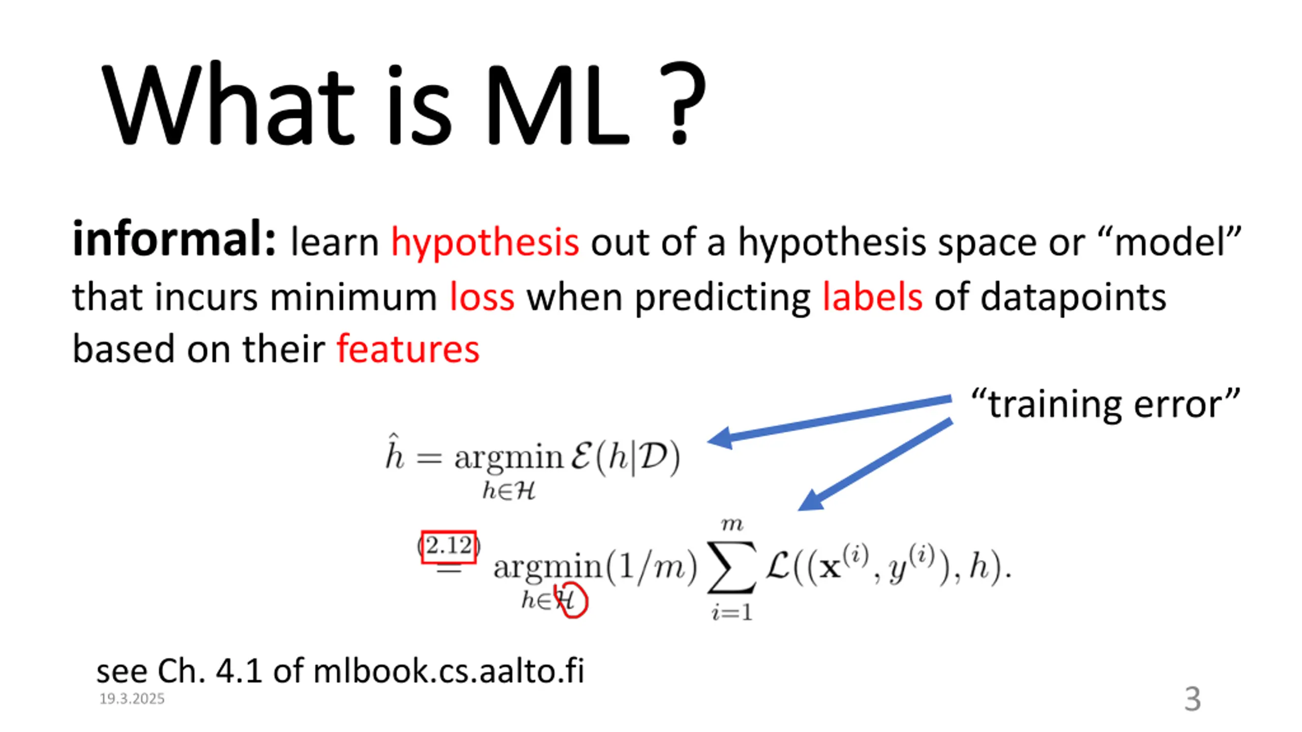 What is ML ? What is ML ? informal: learn hypothesis out of a hypothesis space or model that incurs minimum loss when predicting labels of datapoints based on their features training error see Ch. 4.1 of mlbook.cs.aalto.fi 19.3.2025 3