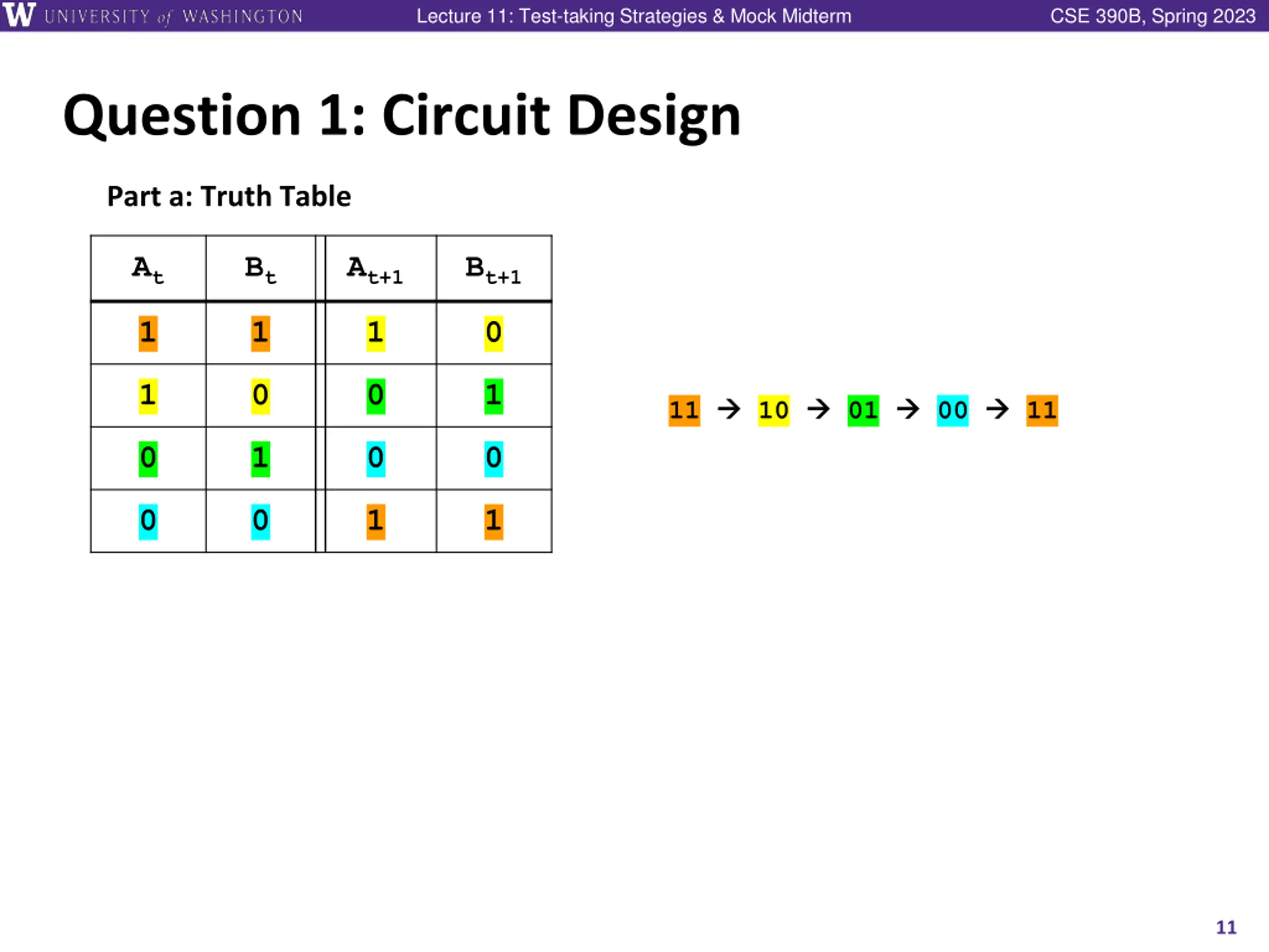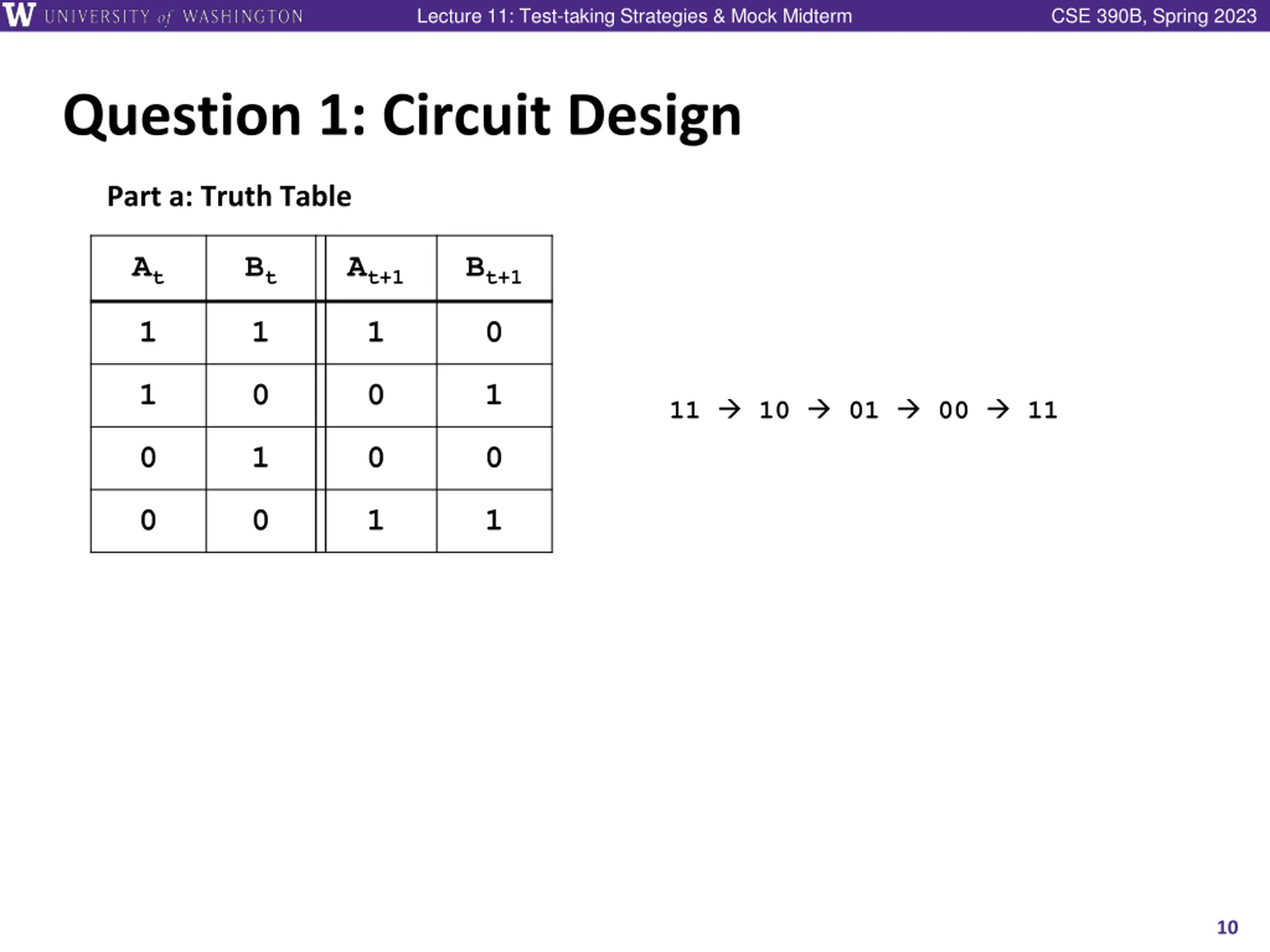 Lecture 11: Test-taking Strategies & Mock Midterm CSE 390B, Spring 2023 Question 1: Circuit Design Part a: Truth Table At Bt At+1 Bt+1 1 1 1 0 1 0 0 1 11 10 01 00 11 0 1 0 0 0 0 1 1 11