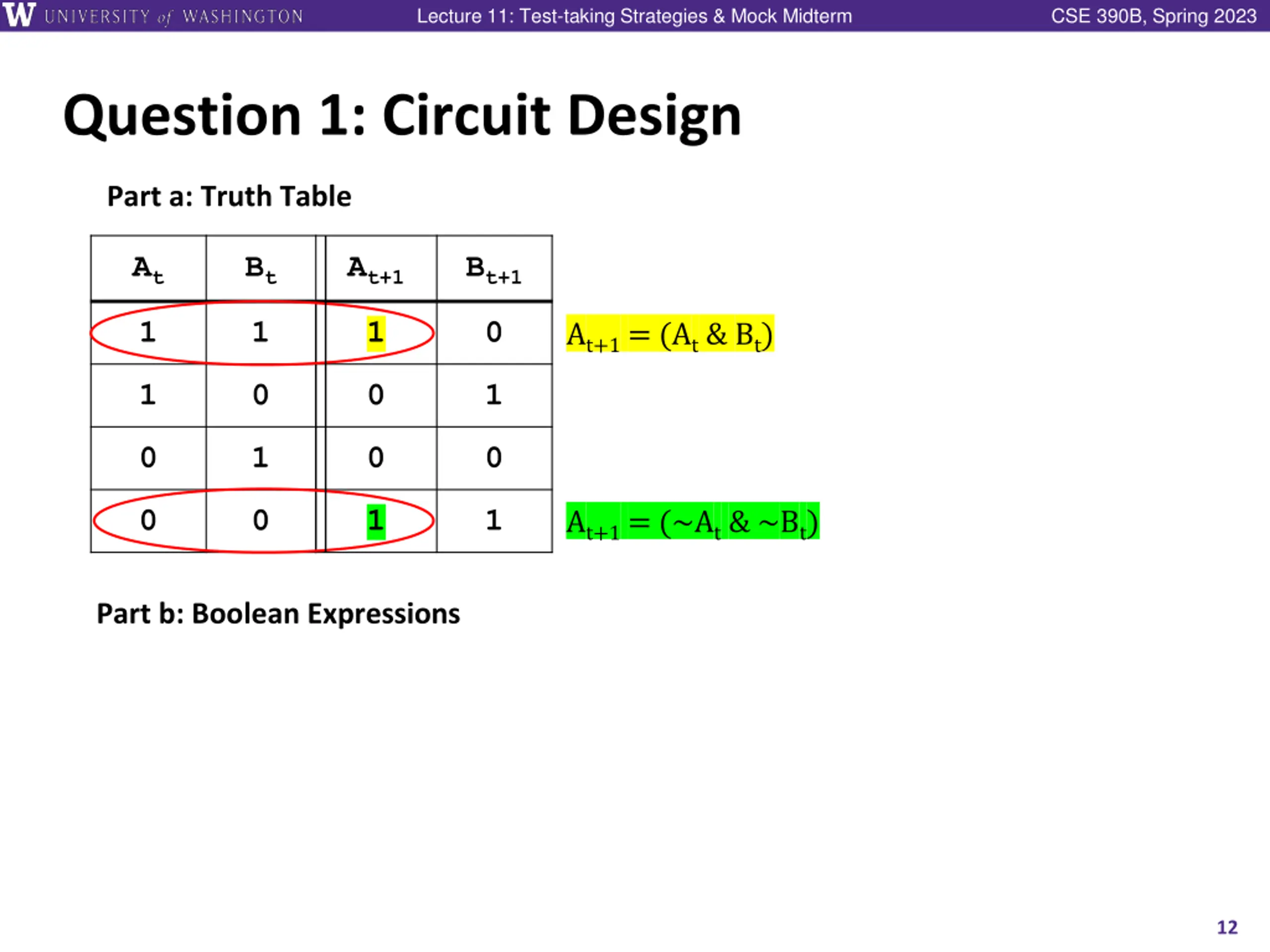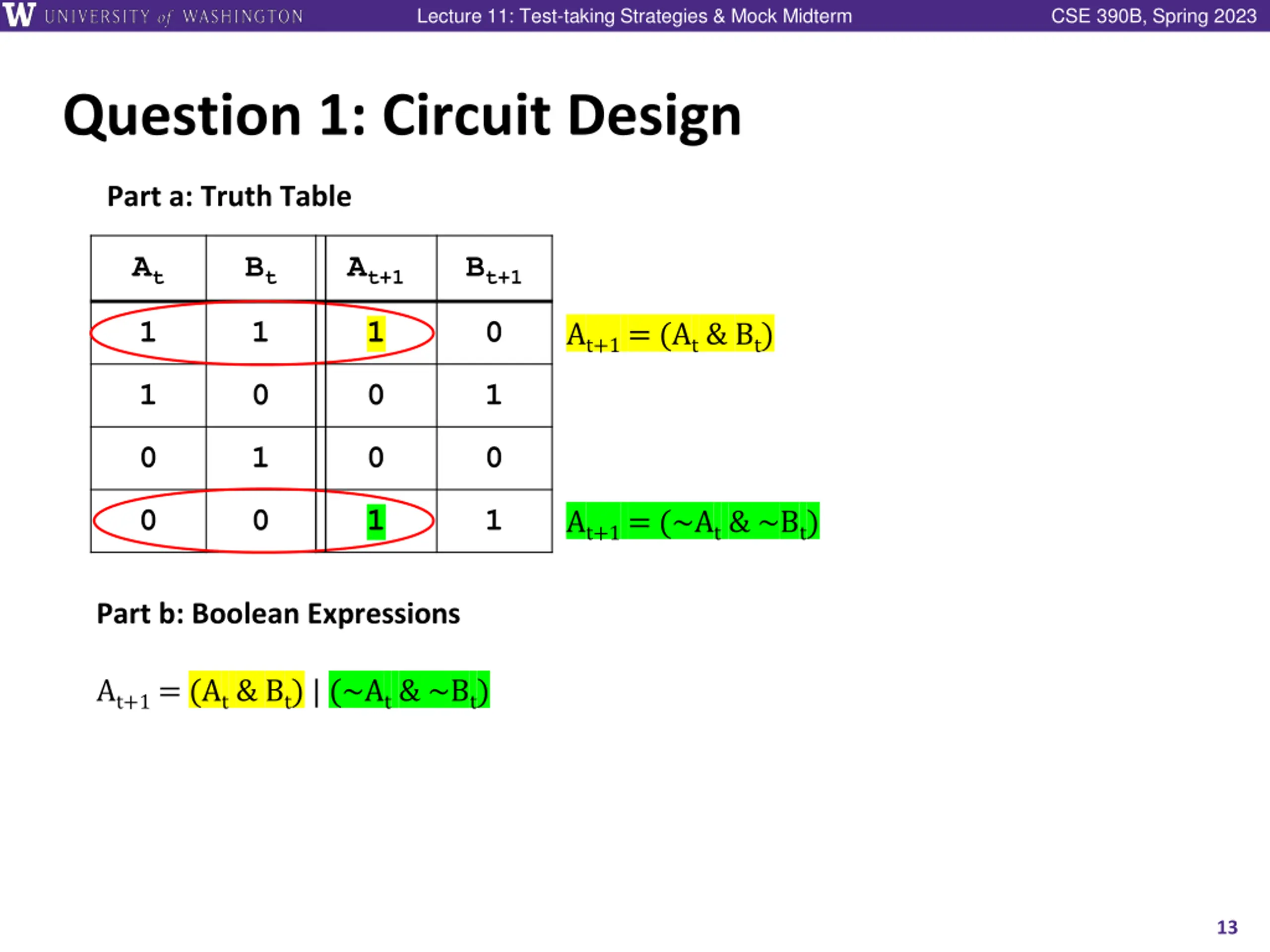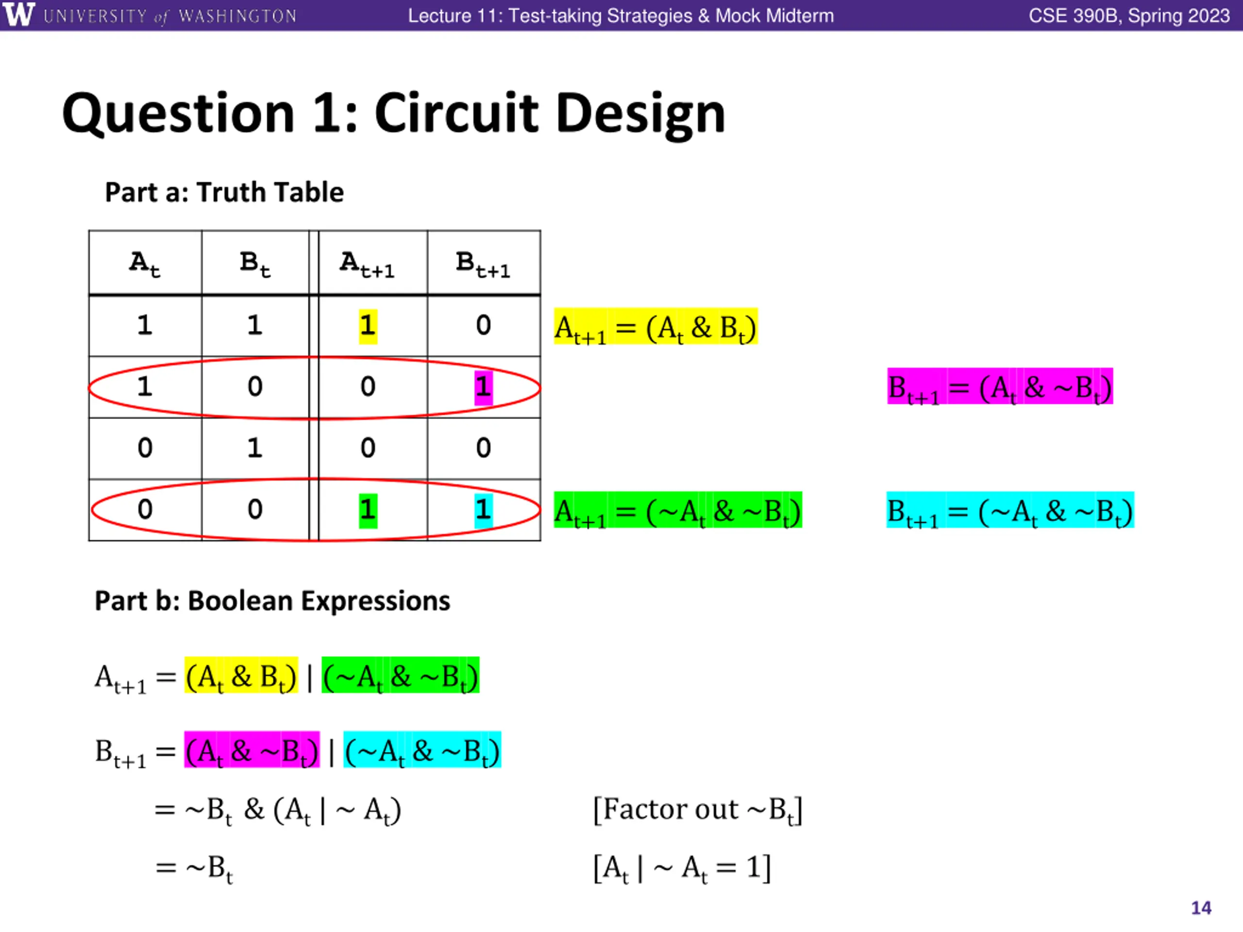 Lecture 11: Test-taking Strategies & Mock Midterm CSE 390B, Spring 2023 Question 1: Circuit Design Part a: Truth Table At Bt At+1 Bt+1 1 1 1 0 At+1= (At& Bt) 1 0 0 1 0 1 0 0 0 0 1 1 At+1= (~At& ~Bt) Part b: Boolean Expressions At+1= (At& Bt) | (~At& ~Bt) 13