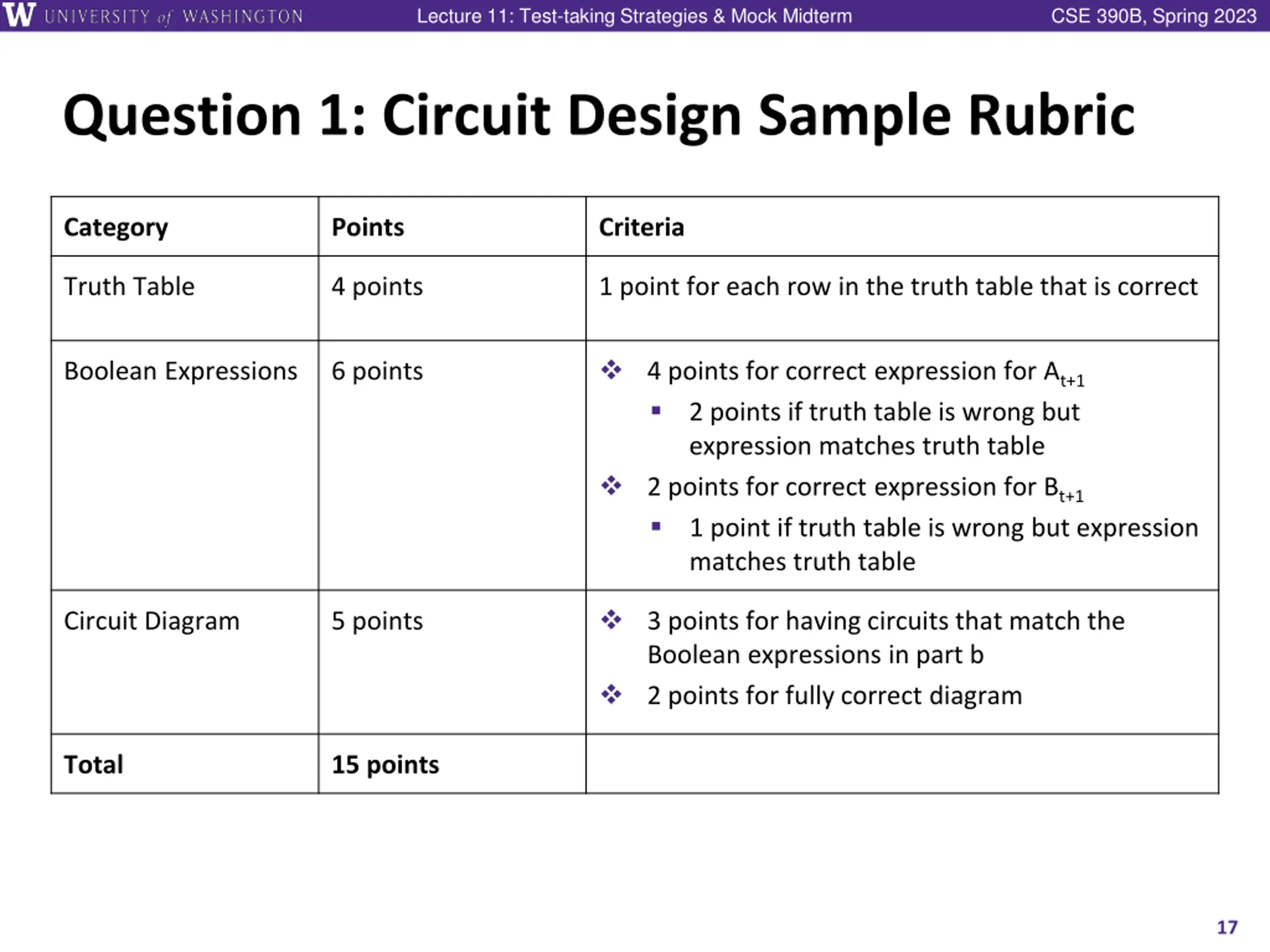Lecture 11: Test-taking Strategies & Mock Midterm CSE 390B, Spring 2023 Question 1: Circuit Design Sample Rubric Category Points Criteria Truth Table 4 points 1 point for each row in the truth table that is correct 4 points for correct expression for At+1 2 points if truth table is wrong but expression matches truth table 2 points for correct expression for Bt+1 1 point if truth table is wrong but expression matches truth table Boolean Expressions 6 points 3 points for having circuits that match the Boolean expressions in part b 2 points for fully correct diagram Circuit Diagram 5 points Total 15 points 17
