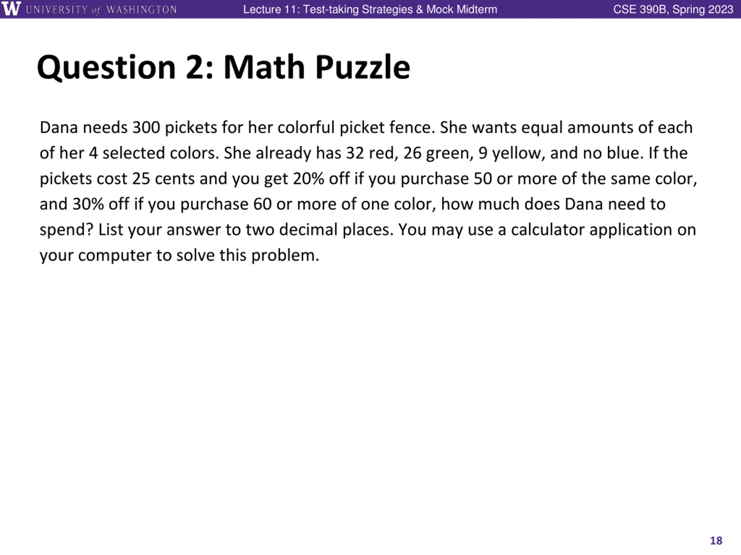 Lecture 11: Test-taking Strategies & Mock Midterm CSE 390B, Spring 2023 Question 2: Math Puzzle Dana needs 300 pickets for her colorful picket fence. She wants equal amounts of each of her 4 selected colors. She already has 32 red, 26 green, 9 yellow, and no blue. If the pickets cost 25 cents and you get 20% off if you purchase 50 or more of the same color, and 30% off if you purchase 60 or more of one color, how much does Dana need to spend? List your answer to two decimal places. You may use a calculator application on your computer to solve this problem. 18