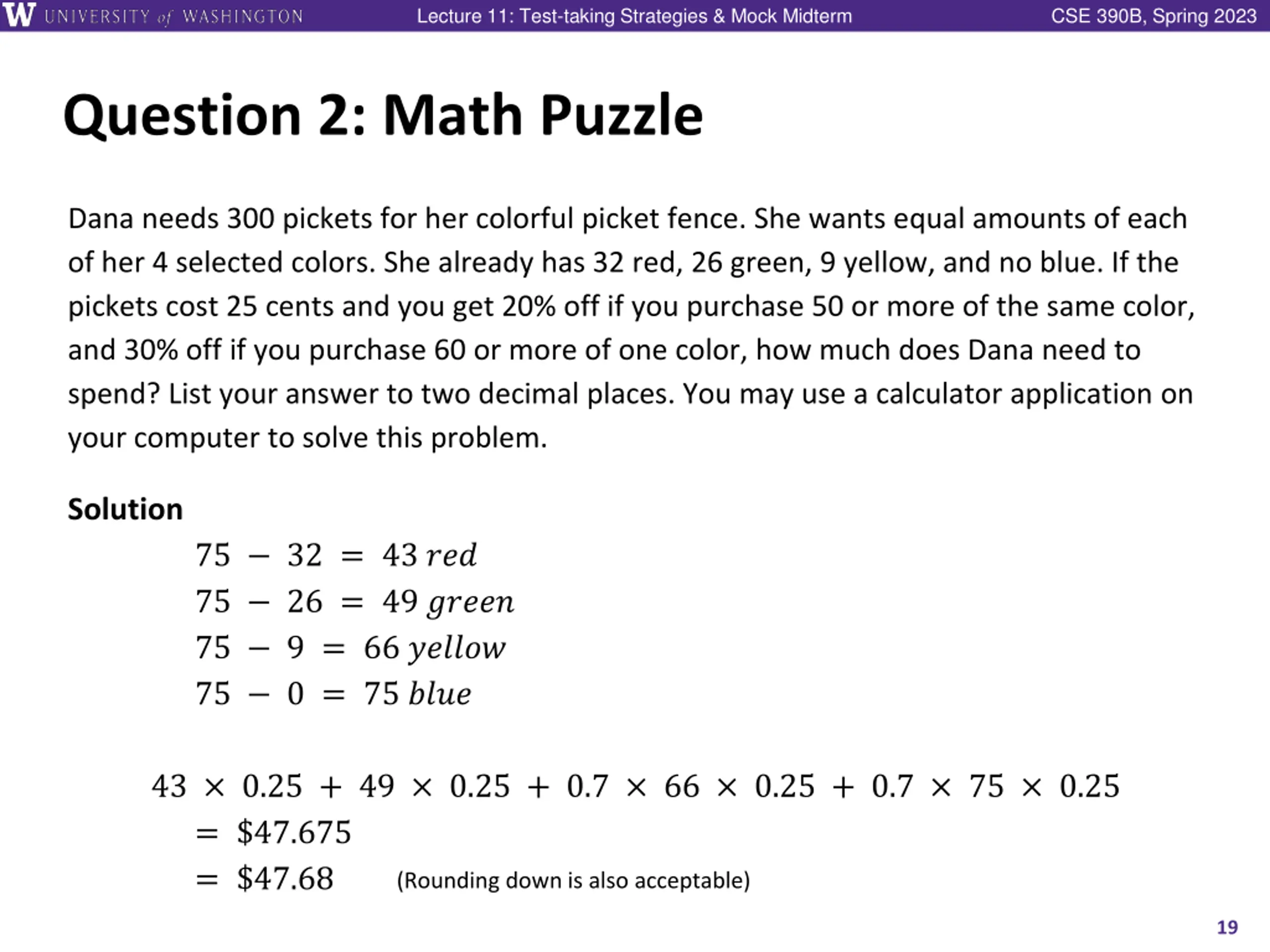 Lecture 11: Test-taking Strategies & Mock Midterm CSE 390B, Spring 2023 Question 2: Math Puzzle Dana needs 300 pickets for her colorful picket fence. She wants equal amounts of each of her 4 selected colors. She already has 32 red, 26 green, 9 yellow, and no blue. If the pickets cost 25 cents and you get 20% off if you purchase 50 or more of the same color, and 30% off if you purchase 60 or more of one color, how much does Dana need to spend? List your answer to two decimal places. You may use a calculator application on your computer to solve this problem. Solution 75 32 = 43 ??? 75 26 = 49 ????? 75 9 = 66 ?????? 75 0 = 75 ???? 43 0.25 + 49 0.25 + 0.7 66 0.25 + 0.7 75 0.25 = $47.675 = $47.68 (Rounding down is also acceptable) 19
