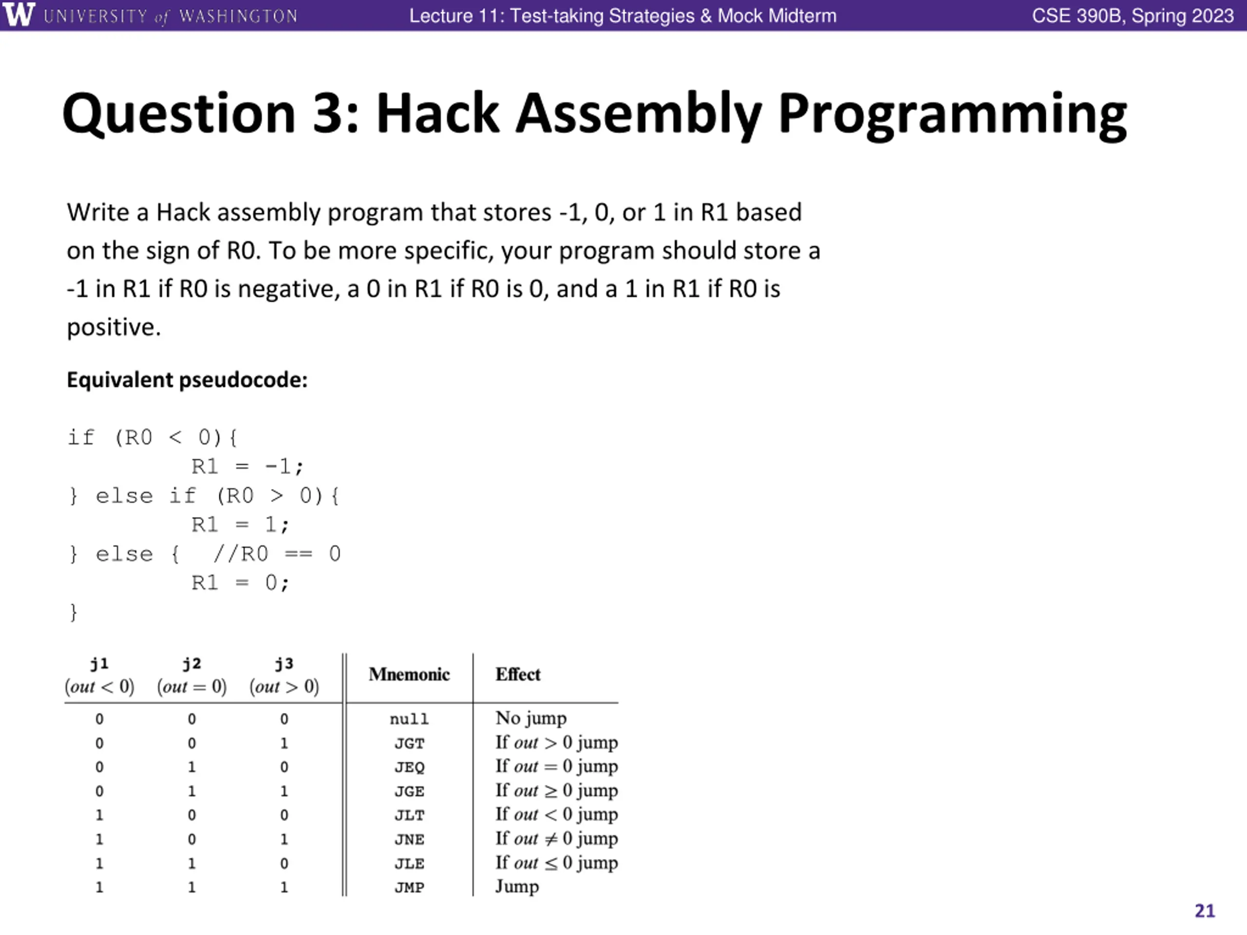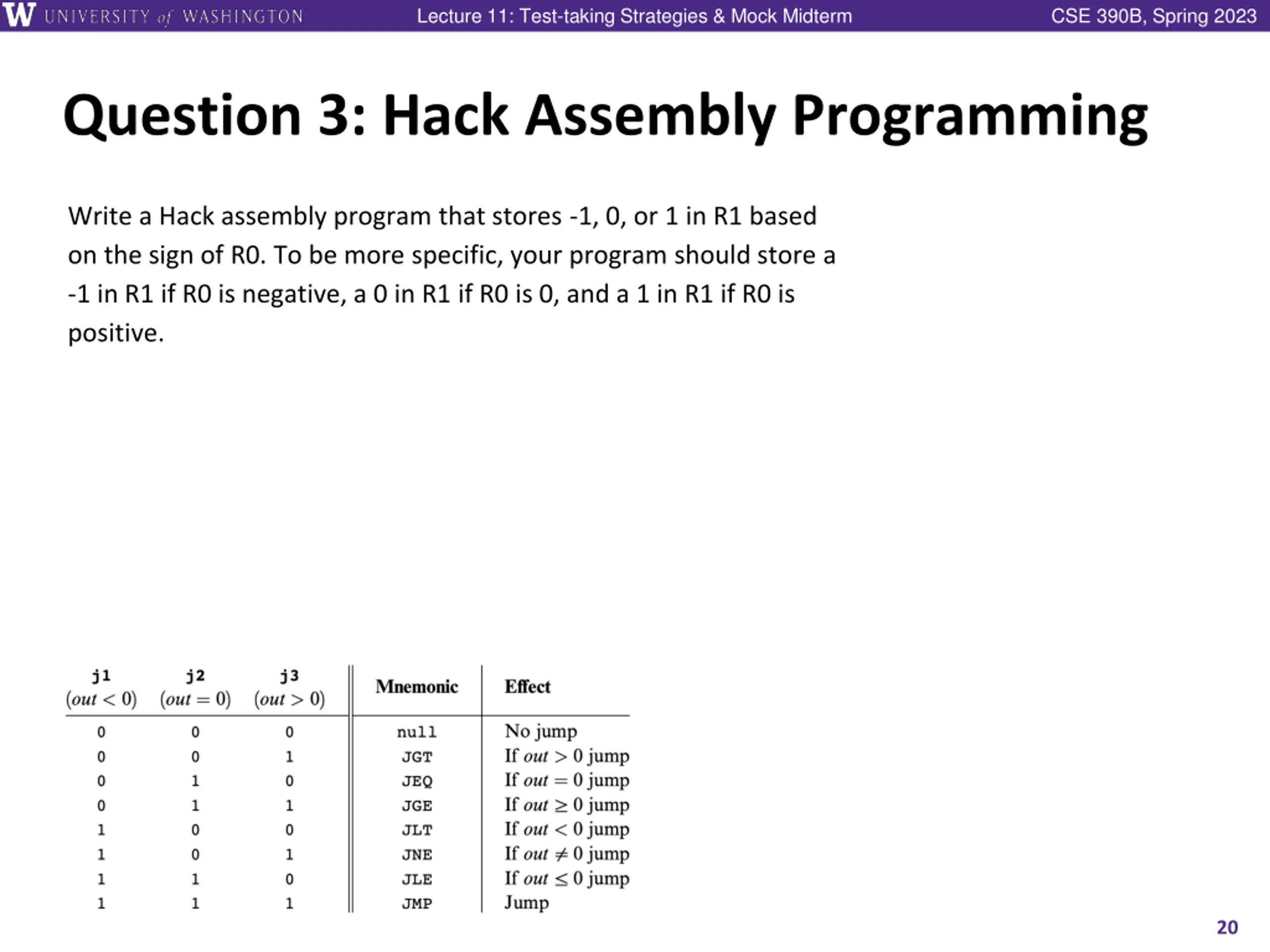 Lecture 11: Test-taking Strategies & Mock Midterm CSE 390B, Spring 2023 Question 3: Hack Assembly Programming Write a Hack assembly program that stores -1, 0, or 1 in R1 based on the sign of R0. To be more specific, your program should store a -1 in R1 if R0 is negative, a 0 in R1 if R0 is 0, and a 1 in R1 if R0 is positive. 20