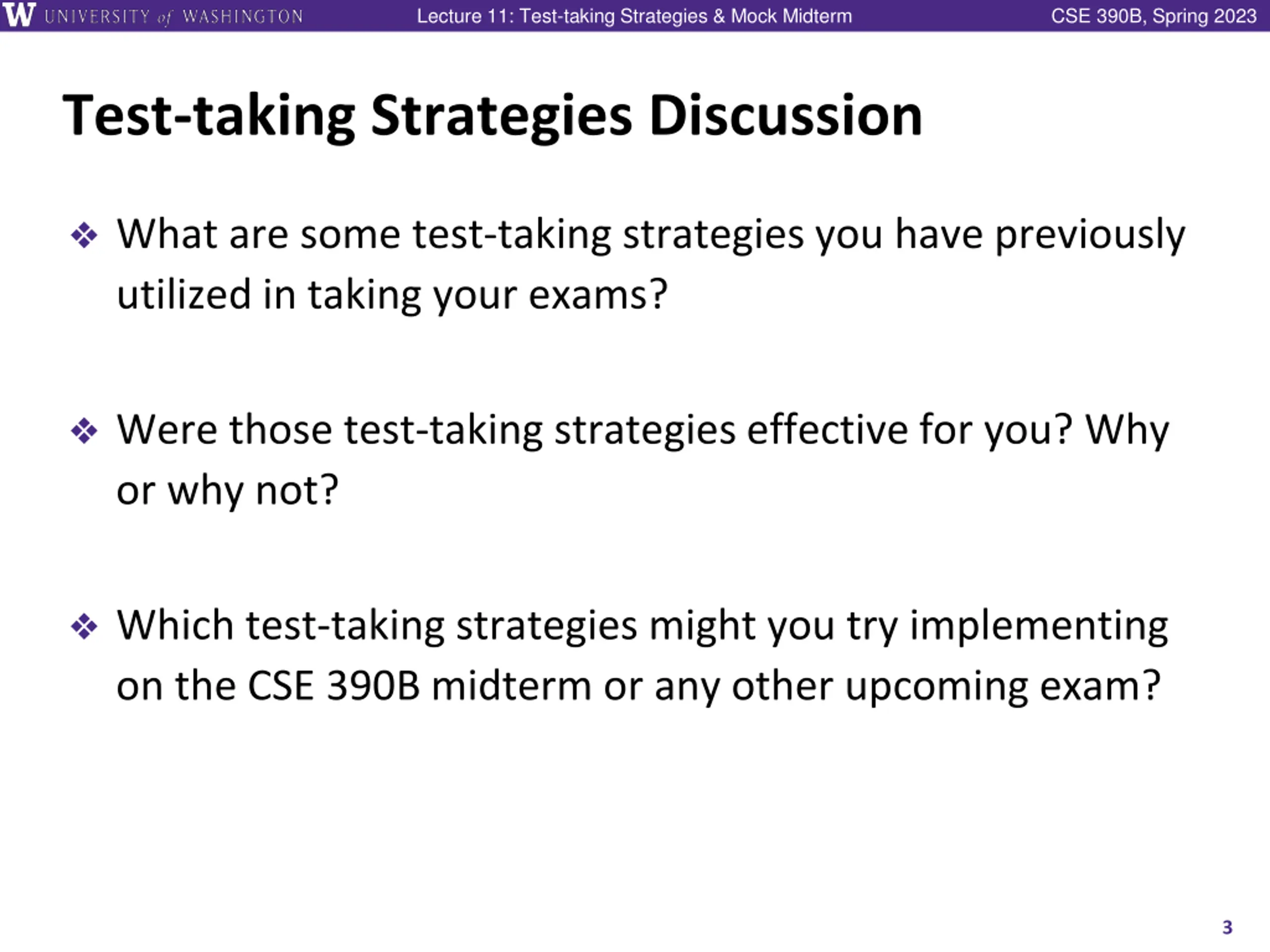Lecture 11: Test-taking Strategies & Mock Midterm CSE 390B, Spring 2023 Test-taking Strategies Discussion What are some test-taking strategies you have previously utilized in taking your exams? Were those test-taking strategies effective for you? Why or why not? Which test-taking strategies might you try implementing on the CSE 390B midterm or any other upcoming exam? 3