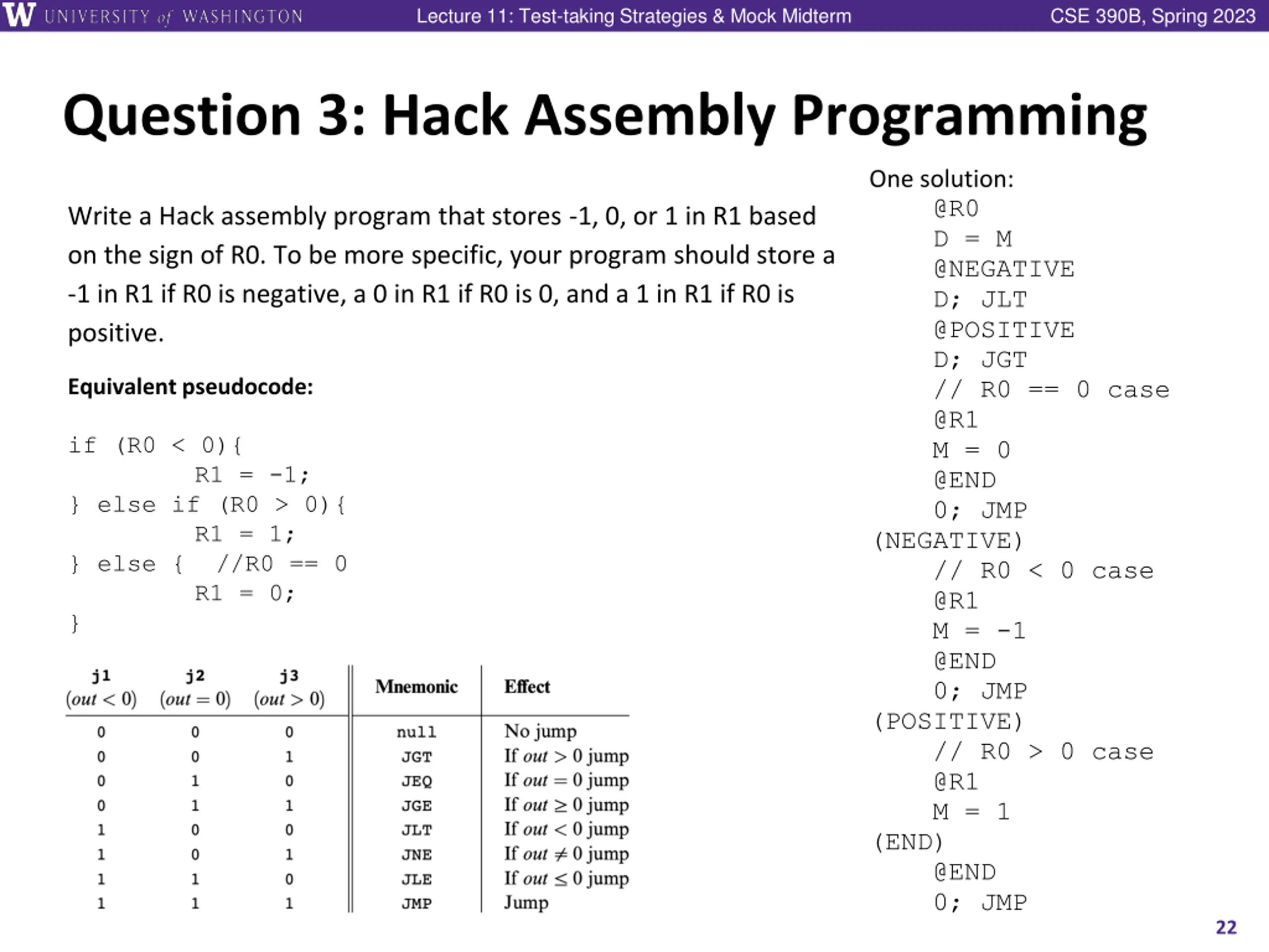Lecture 11: Test-taking Strategies & Mock Midterm CSE 390B, Spring 2023 Question 3: Hack Assembly Programming Write a Hack assembly program that stores -1, 0, or 1 in R1 based on the sign of R0. To be more specific, your program should store a -1 in R1 if R0 is negative, a 0 in R1 if R0 is 0, and a 1 in R1 if R0 is positive. Equivalent pseudocode: if (R0 < 0){ R1 = -1; } else if (R0 > 0){ R1 = 1; } else { //R0 == 0 R1 = 0; } 21