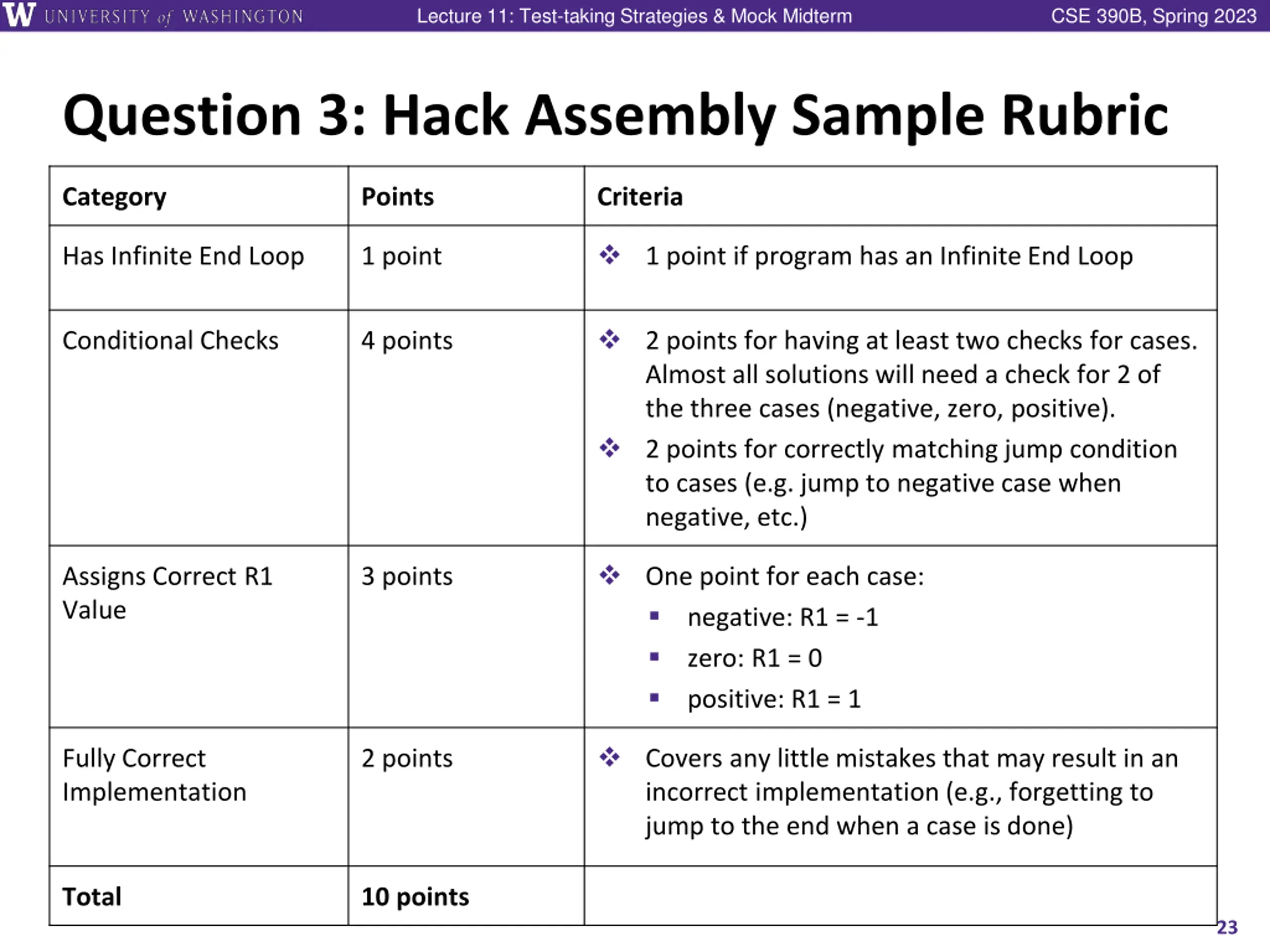 Lecture 11: Test-taking Strategies & Mock Midterm CSE 390B, Spring 2023 Question 3: Hack Assembly Sample Rubric Category Points Criteria 1 point if program has an Infinite End Loop Has Infinite End Loop 1 point 2 points for having at least two checks for cases. Almost all solutions will need a check for 2 of the three cases (negative, zero, positive). 2 points for correctly matching jump condition to cases (e.g. jump to negative case when negative, etc.) Conditional Checks 4 points One point for each case: negative: R1 = -1 zero: R1 = 0 positive: R1 = 1 Assigns Correct R1 Value 3 points Covers any little mistakes that may result in an incorrect implementation (e.g., forgetting to jump to the end when a case is done) Fully Correct Implementation 2 points Total 10 points 23