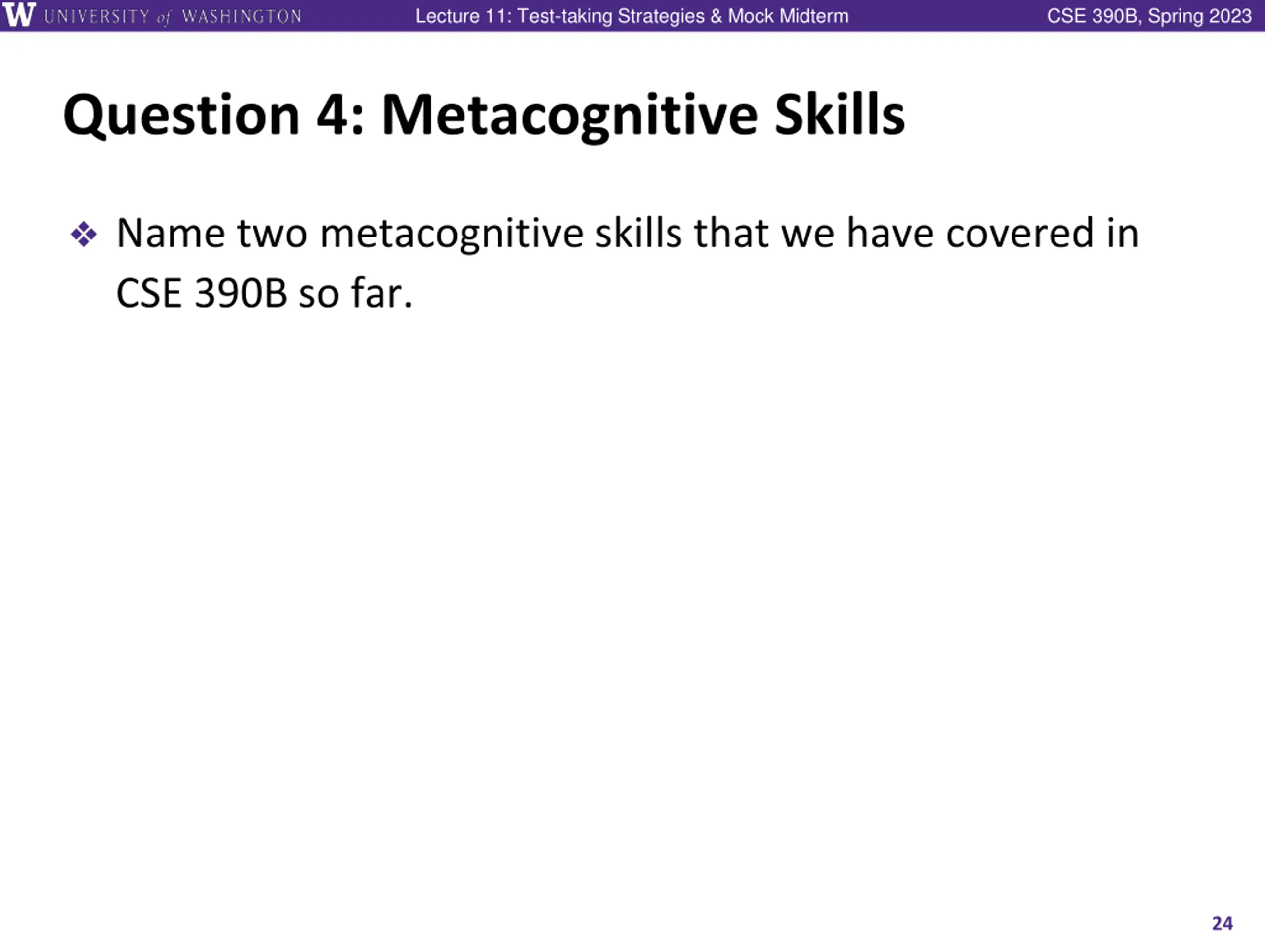 Lecture 11: Test-taking Strategies & Mock Midterm CSE 390B, Spring 2023 Question 4: Metacognitive Skills Name two metacognitive skills that we have covered in CSE 390B so far. 24