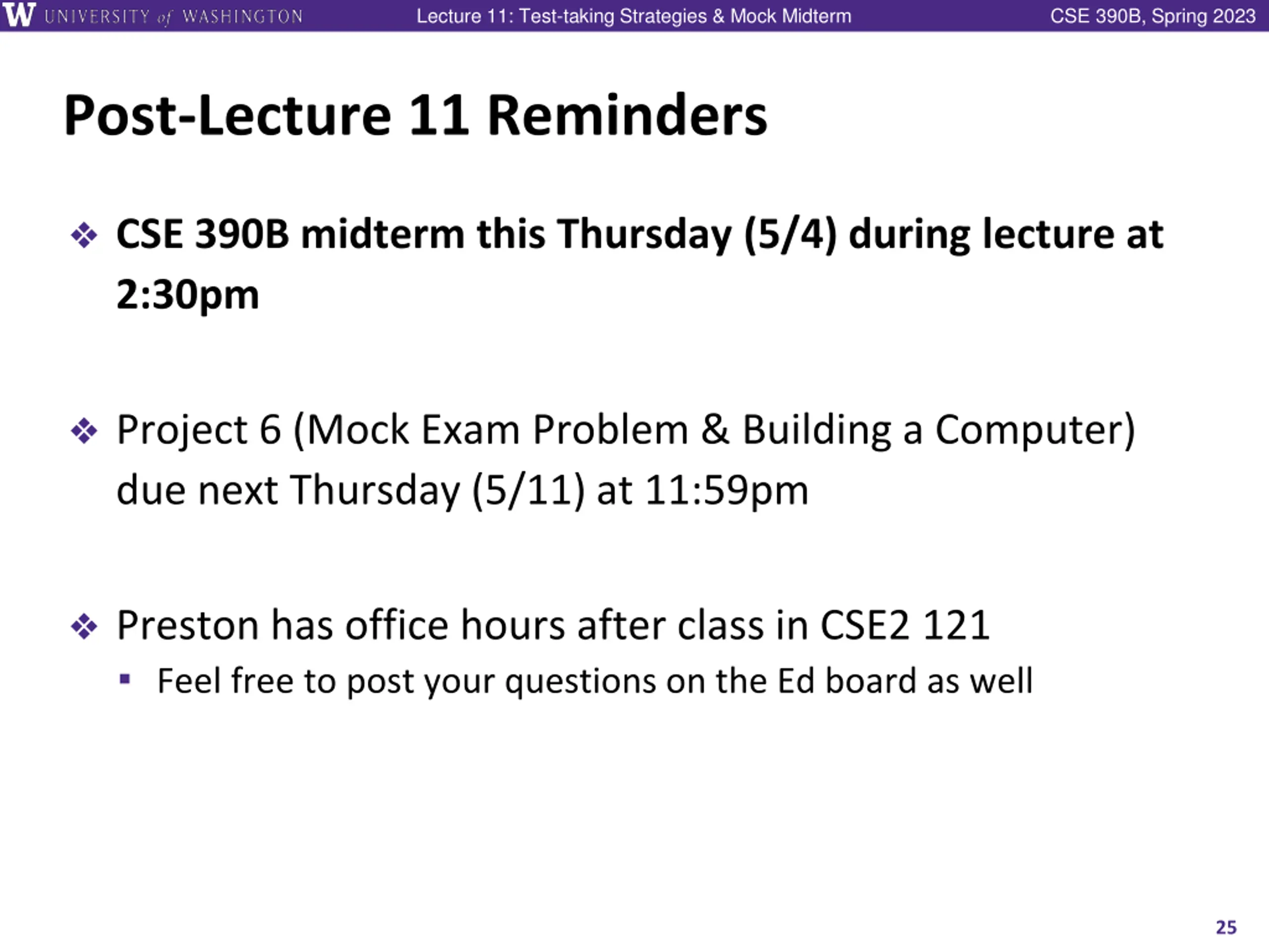Lecture 11: Test-taking Strategies & Mock Midterm CSE 390B, Spring 2023 Post-Lecture 11 Reminders CSE 390B midterm this Thursday (5/4) during lecture at 2:30pm Project 6 (Mock Exam Problem & Building a Computer) due next Thursday (5/11) at 11:59pm Preston has office hours after class in CSE2 121 Feel free to post your questions on the Ed board as well 25
