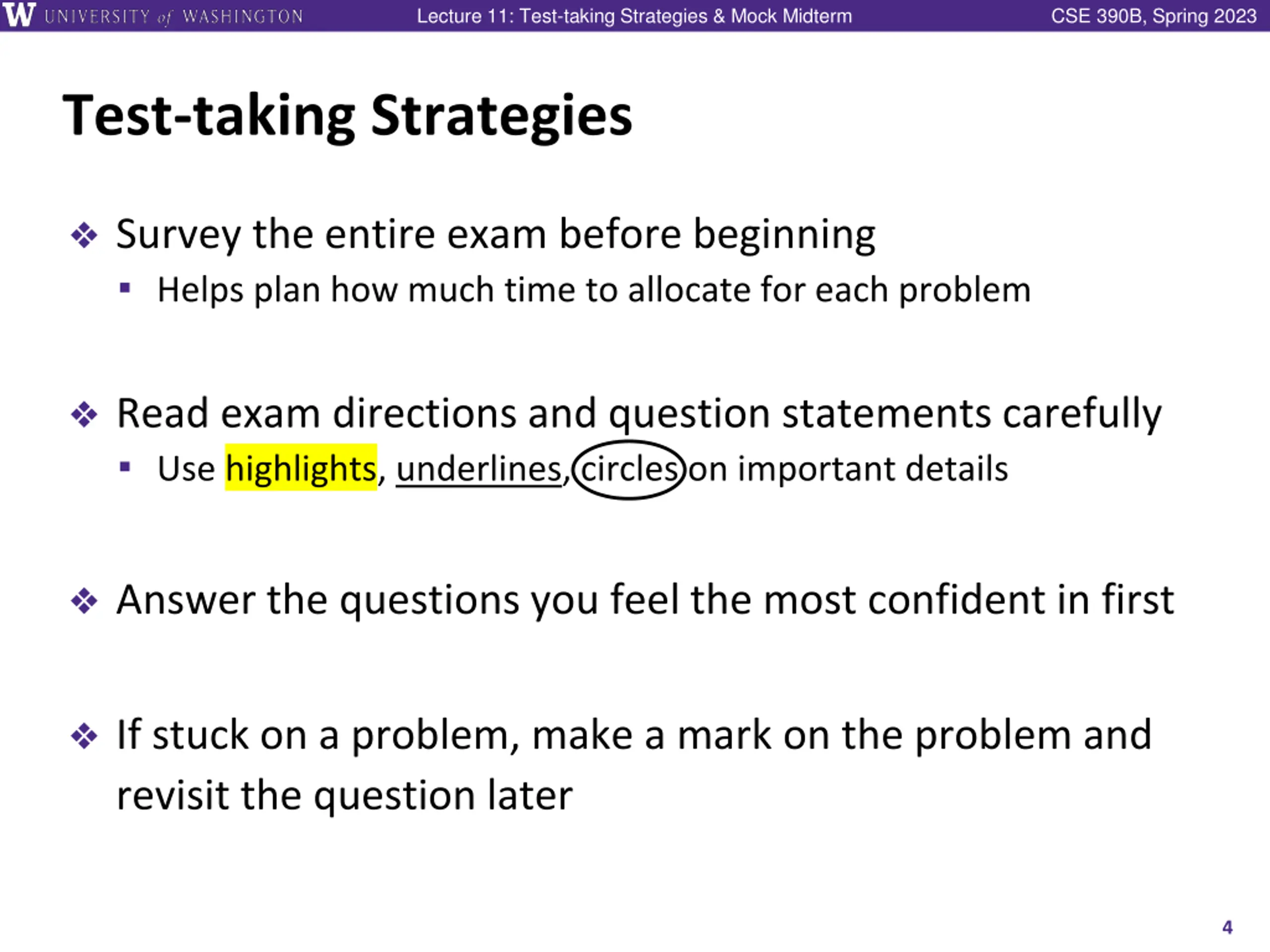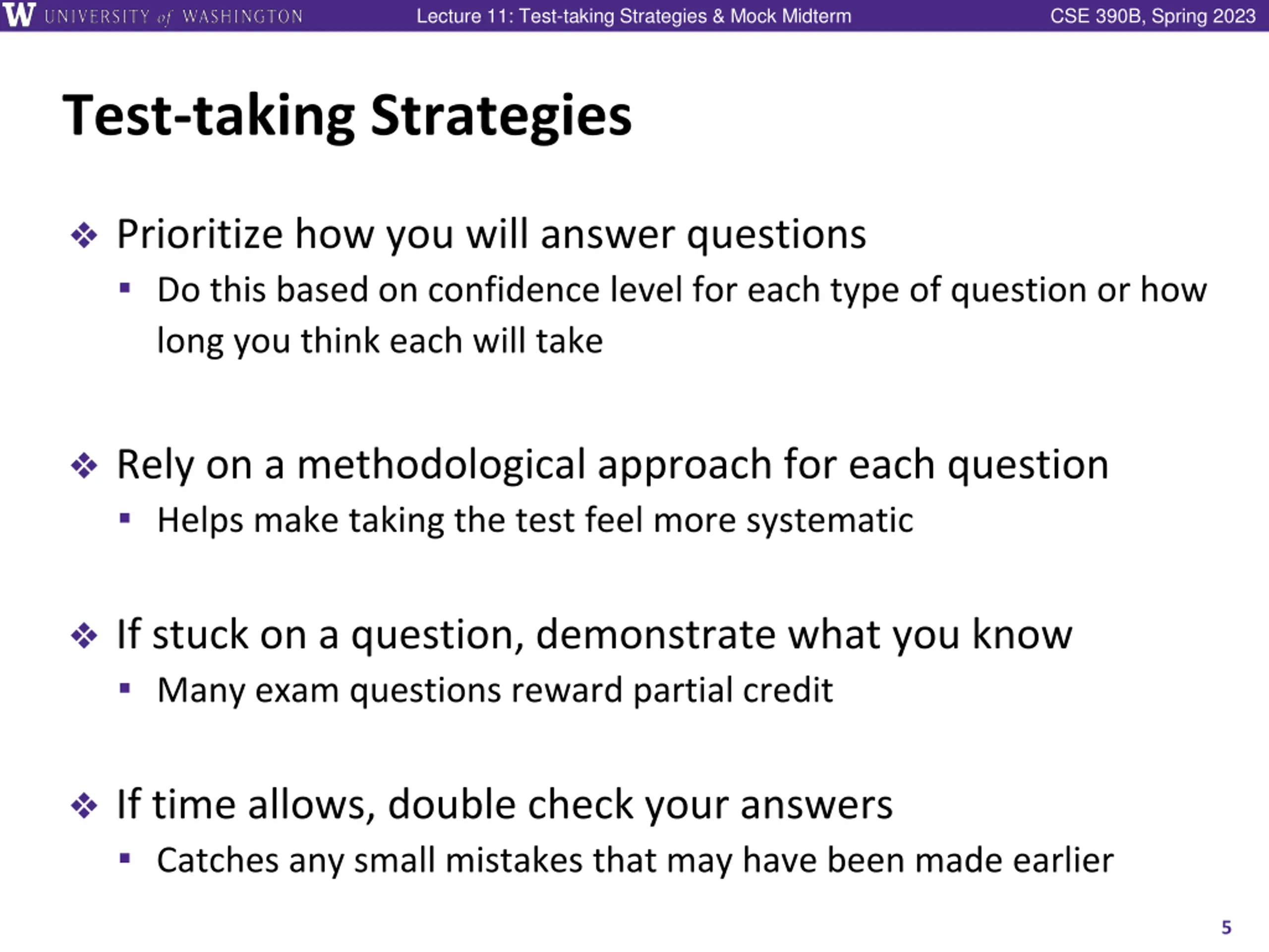 Lecture 11: Test-taking Strategies & Mock Midterm CSE 390B, Spring 2023 Test-taking Strategies Survey the entire exam before beginning Helps plan how much time to allocate for each problem Read exam directions and question statements carefully Use highlights, underlines, circles on important details Answer the questions you feel the most confident in first If stuck on a problem, make a mark on the problem and revisit the question later 4