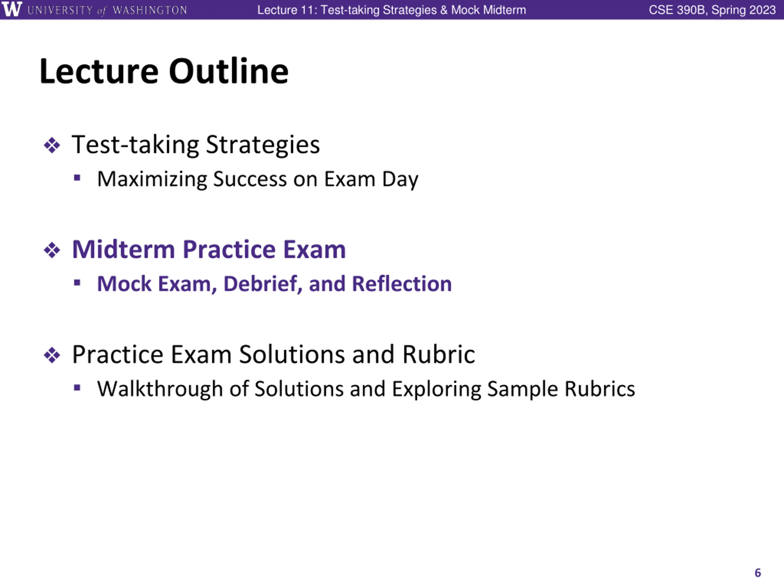 Lecture 11: Test-taking Strategies & Mock Midterm CSE 390B, Spring 2023 Lecture Outline Test-taking Strategies Maximizing Success on Exam Day Midterm Practice Exam Mock Exam, Debrief, and Reflection Practice Exam Solutions and Rubric Walkthrough of Solutions and Exploring Sample Rubrics 6