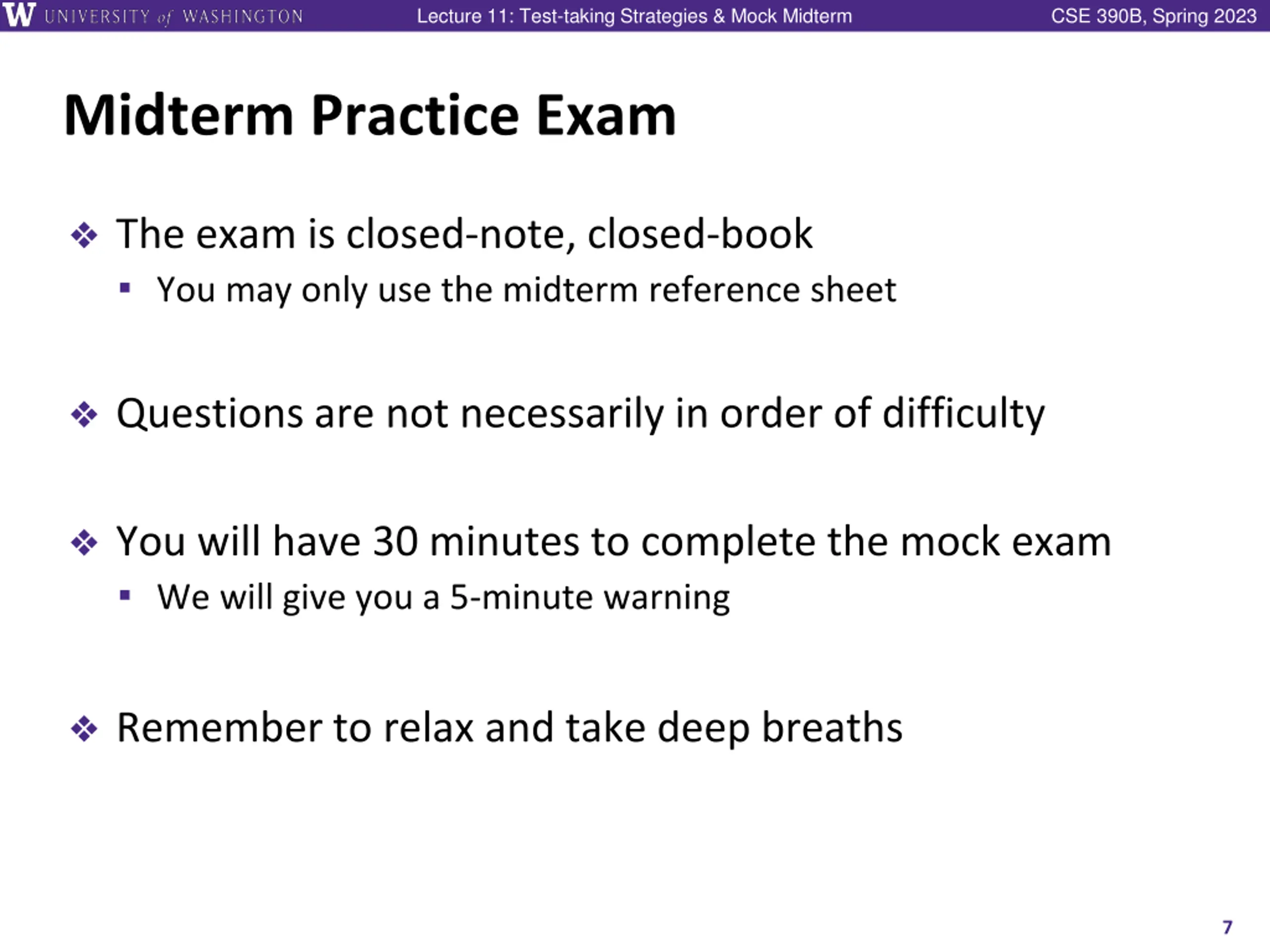 Lecture 11: Test-taking Strategies & Mock Midterm CSE 390B, Spring 2023 Midterm Practice Exam The exam is closed-note, closed-book You may only use the midterm reference sheet Questions are not necessarily in order of difficulty You will have 30 minutes to complete the mock exam We will give you a 5-minute warning Remember to relax and take deep breaths 7