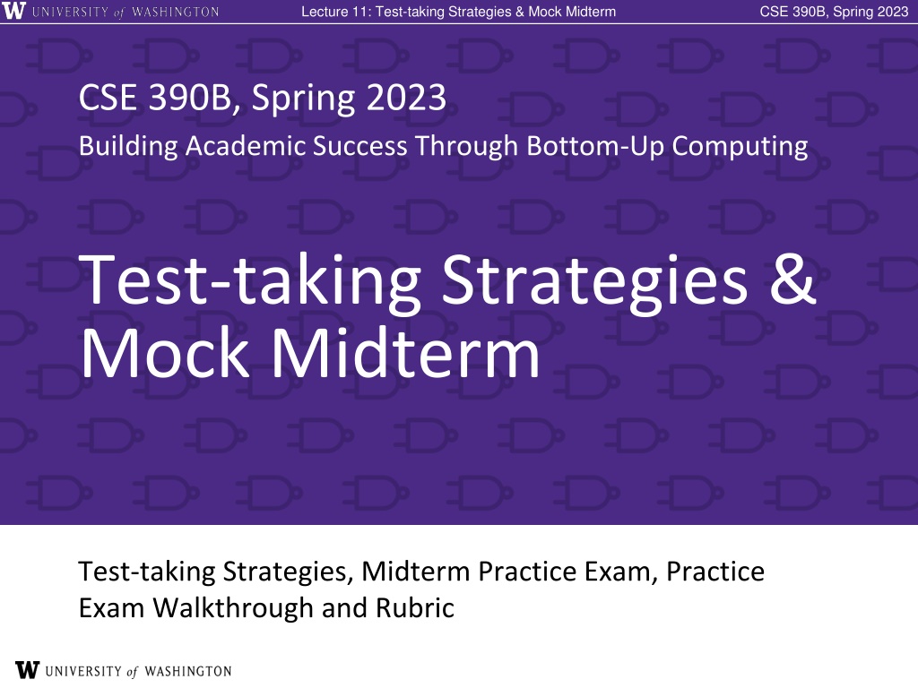 Lecture 11: Test-taking Strategies & Mock Midterm Lecture 11: Test-taking Strategies & Mock Midterm CSE 390B, Spring 2023 CSE 390B, Spring 2023 CSE 390B, Spring 2023 Building Academic Success Through Bottom-Up Computing Test-taking Strategies & Mock Midterm Test-taking Strategies, Midterm Practice Exam, Practice Exam Walkthrough and Rubric