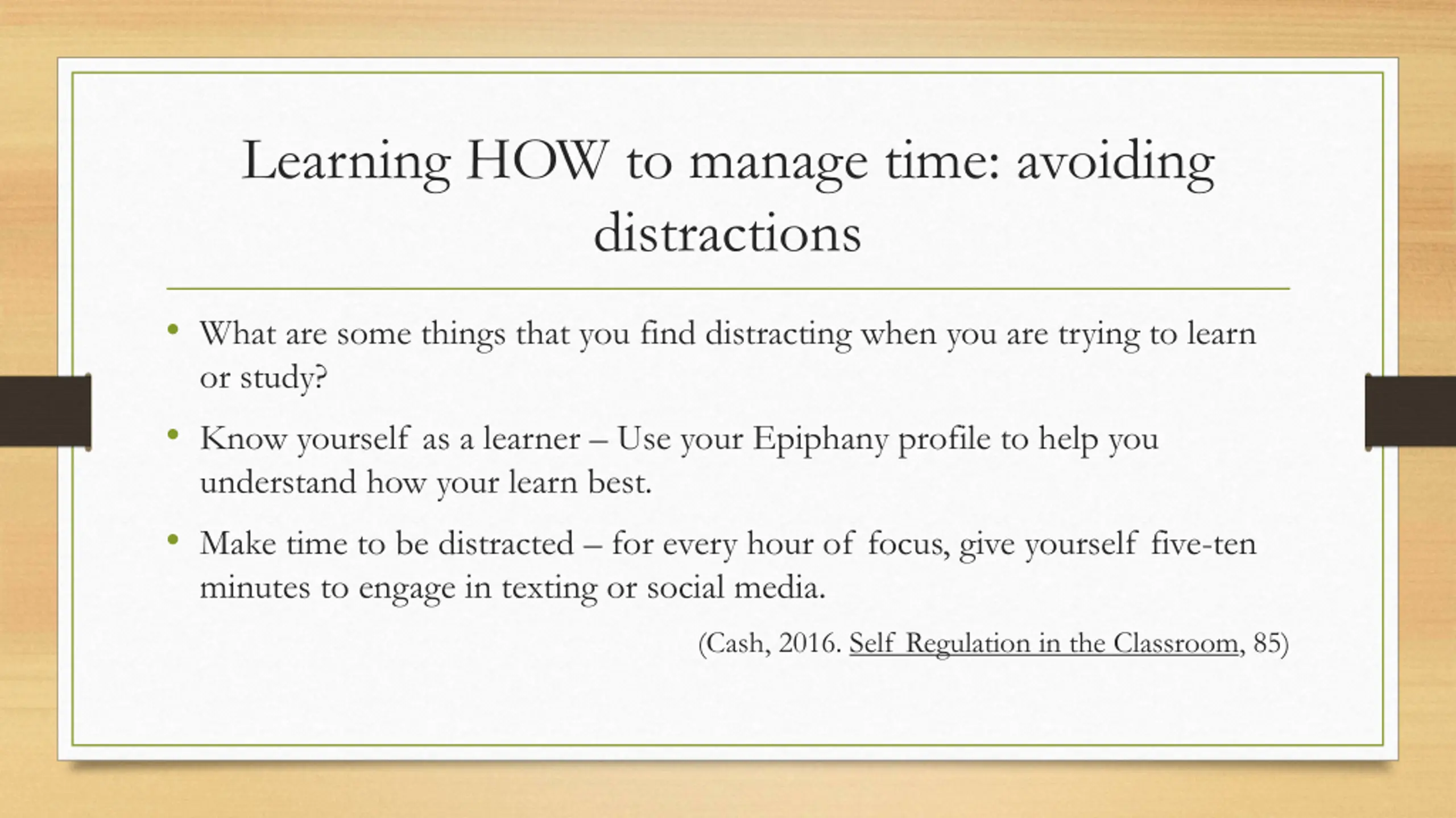 Learning HOW to manage time: avoiding distractions What are some things that you find distracting when you are trying to learn or study? Know yourself as a learner Use your Epiphany profile to help you understand how your learn best. Make time to be distracted for every hour of focus, give yourself five-ten minutes to engage in texting or social media. (Cash, 2016. Self Regulation in the Classroom, 85)