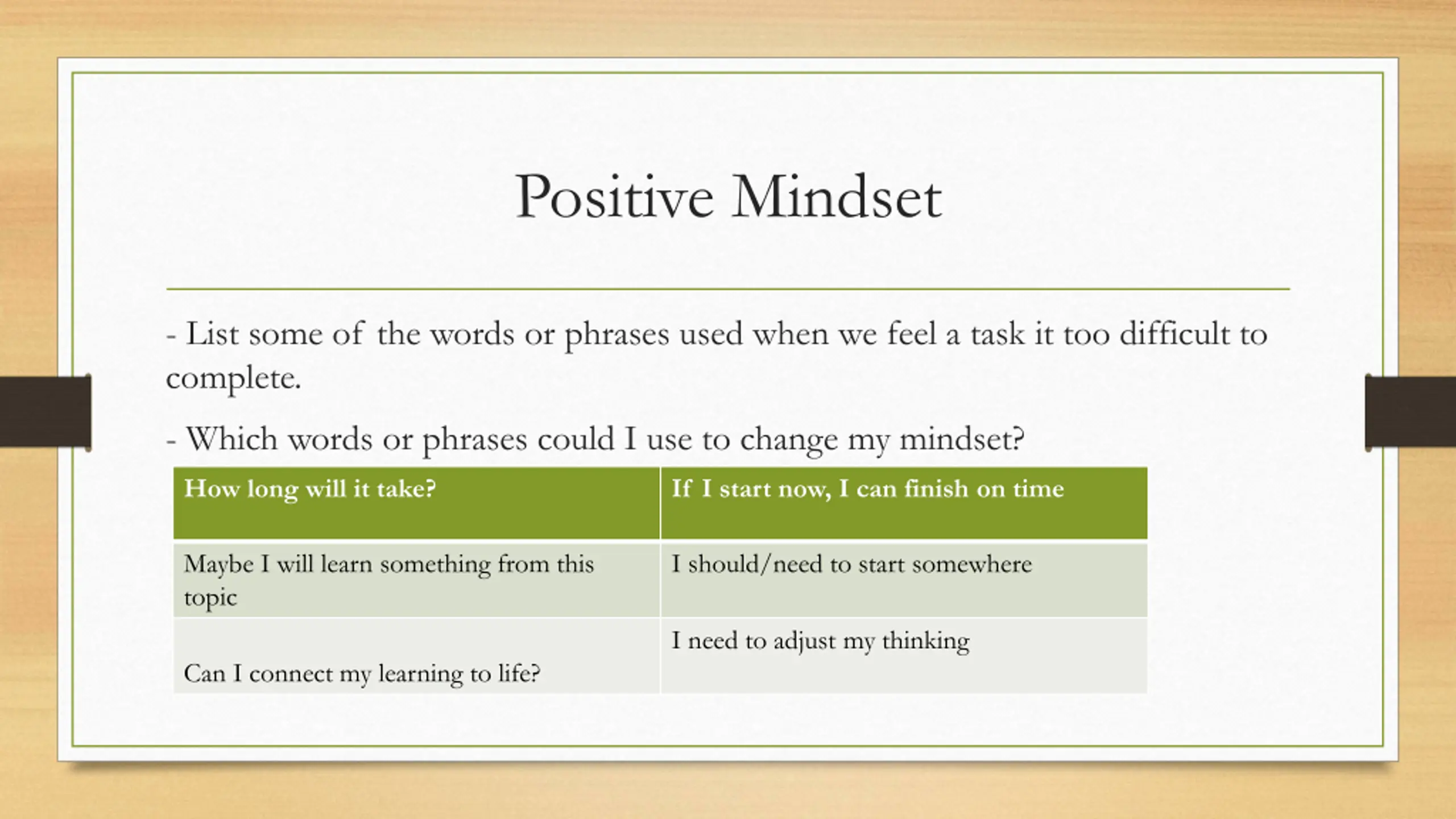 Positive Mindset - List some of the words or phrases used when we feel a task it too difficult to complete. - Which words or phrases could I use to change my mindset? How long will it take? If I start now, I can finish on time Maybe I will learn something from this topic I should/need to start somewhere I need to adjust my thinking Can I connect my learning to life?
