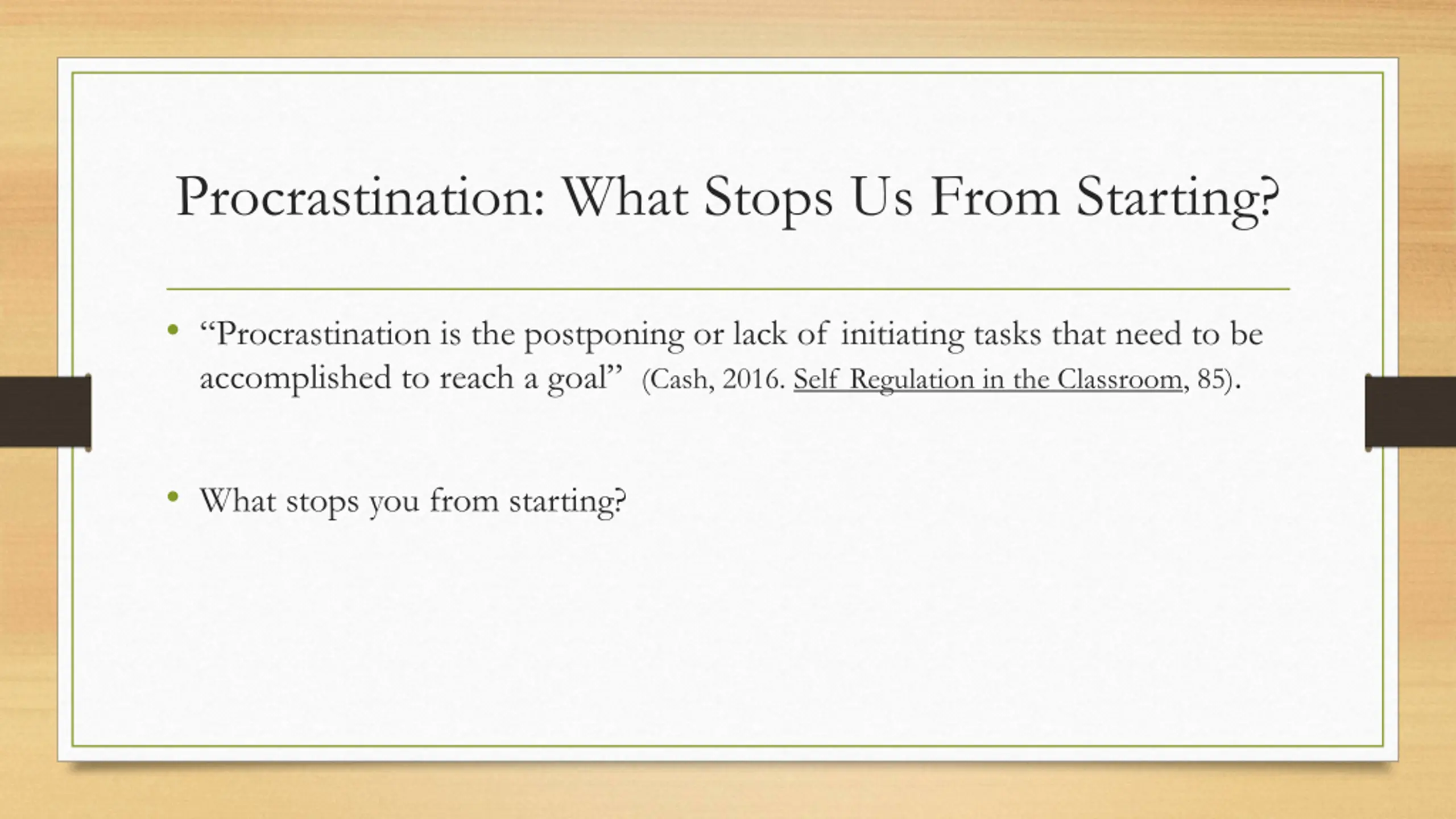 Procrastination: What Stops Us From Starting? Procrastination is the postponing or lack of initiating tasks that need to be accomplished to reach a goal (Cash, 2016. Self Regulation in the Classroom, 85). What stops you from starting?