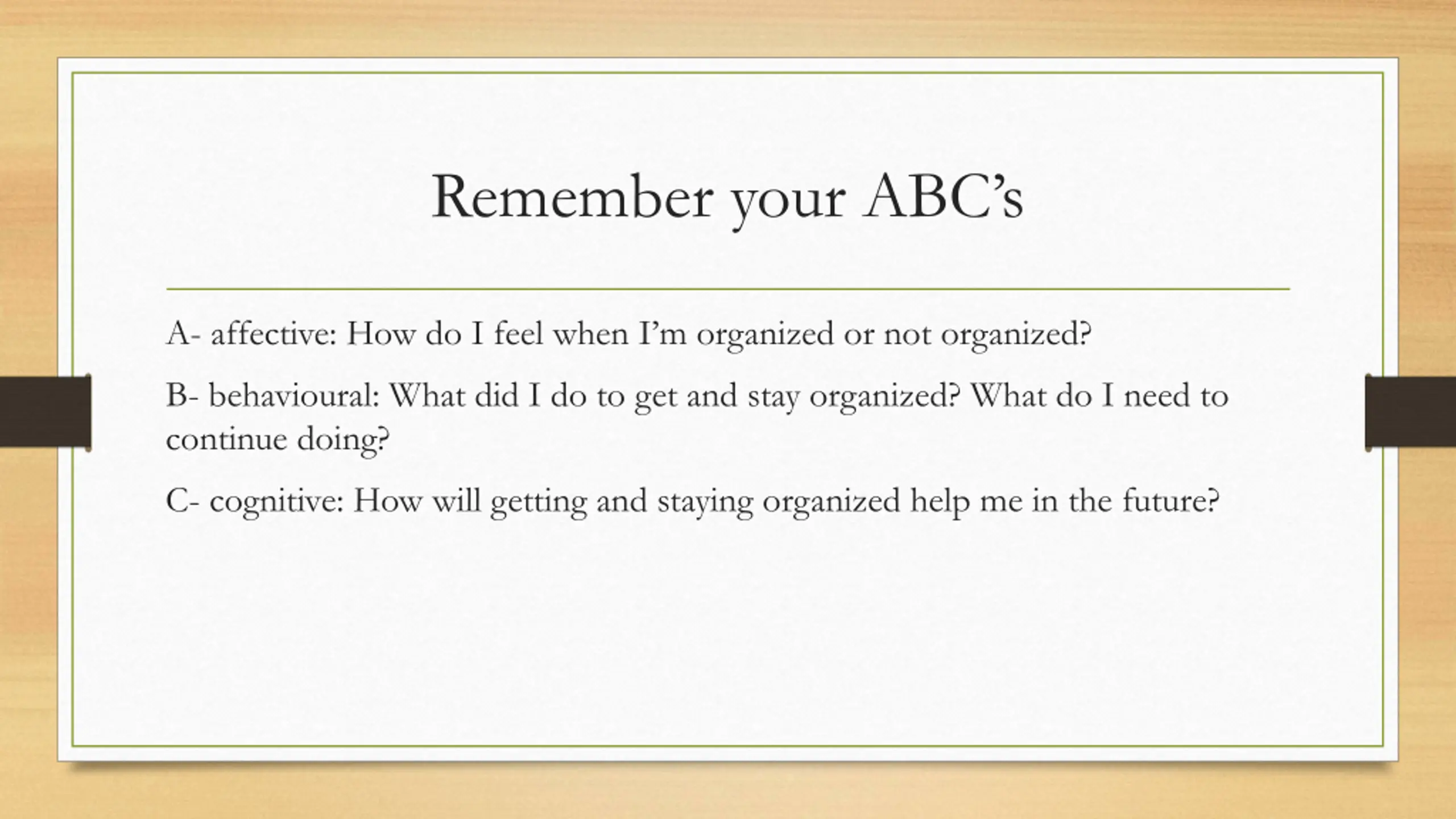 Remember your ABCs A- affective: How do I feel when I m organized or not organized? B- behavioural: What did I do to get and stay organized? What do I need to continue doing? C- cognitive: How will getting and staying organized help me in the future?