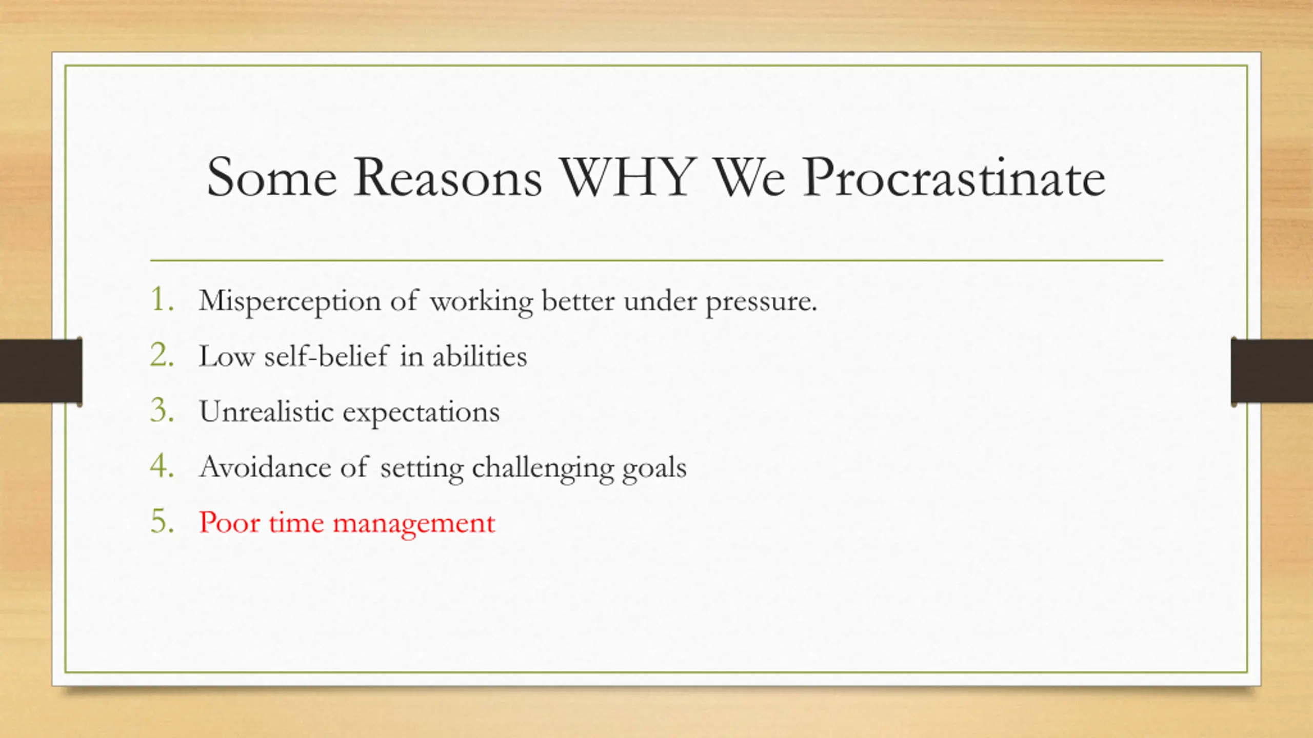 Some Reasons WHY We Procrastinate 1. Misperception of working better under pressure. 2. Low self-belief in abilities 3. Unrealistic expectations 4. Avoidance of setting challenging goals 5. Poor time management