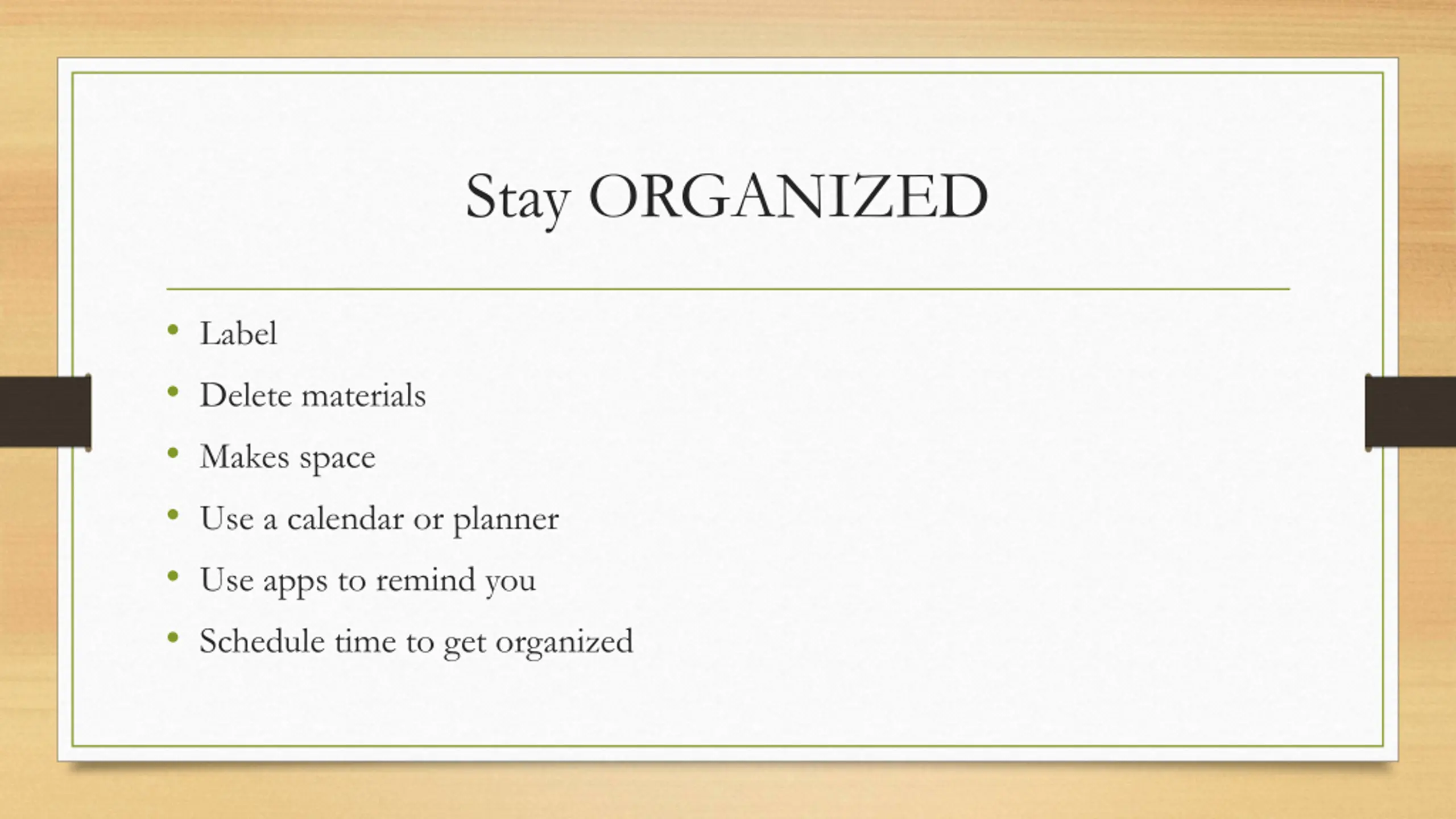 Stay ORGANIZED Label Delete materials Makes space Use a calendar or planner Use apps to remind you Schedule time to get organized