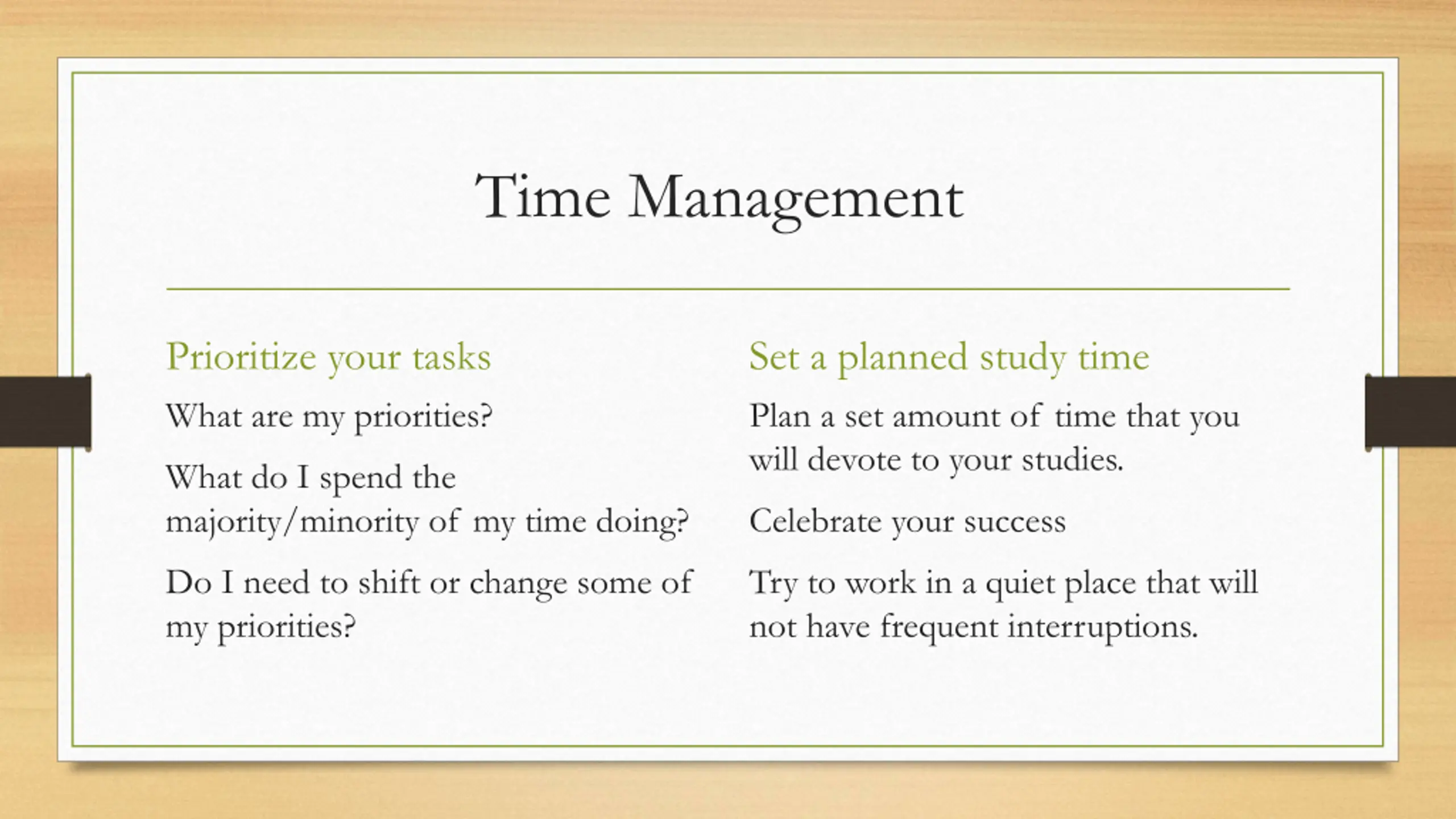 Time Management Prioritize your tasks What are my priorities? Set a planned study time Plan a set amount of time that you will devote to your studies. What do I spend the majority/minority of my time doing? Celebrate your success Do I need to shift or change some of my priorities? Try to work in a quiet place that will not have frequent interruptions.
