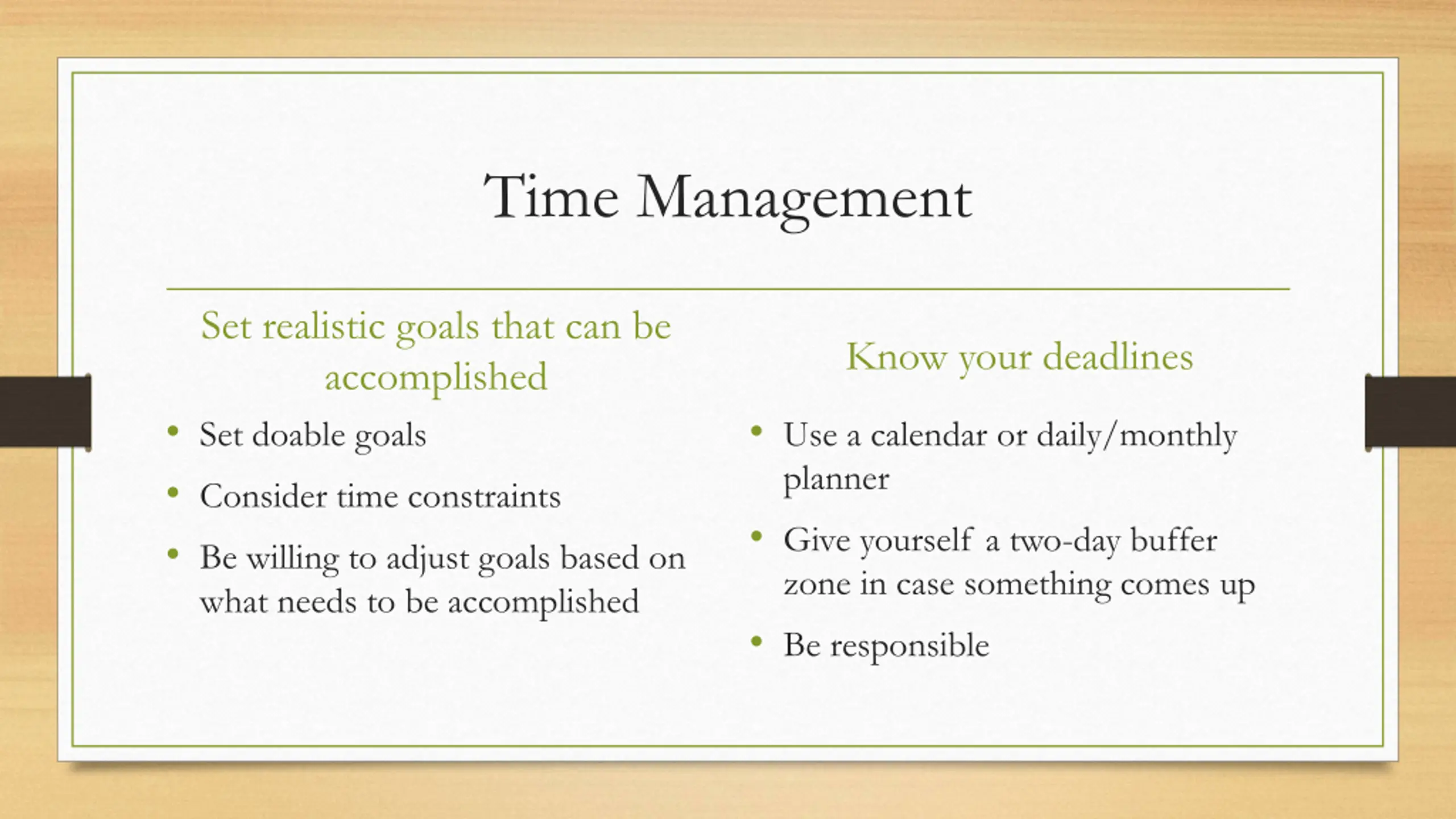 Time Management Set realistic goals that can be accomplished Set doable goals Consider time constraints Be willing to adjust goals based on what needs to be accomplished Know your deadlines Use a calendar or daily/monthly planner Give yourself a two-day buffer zone in case something comes up Be responsible
