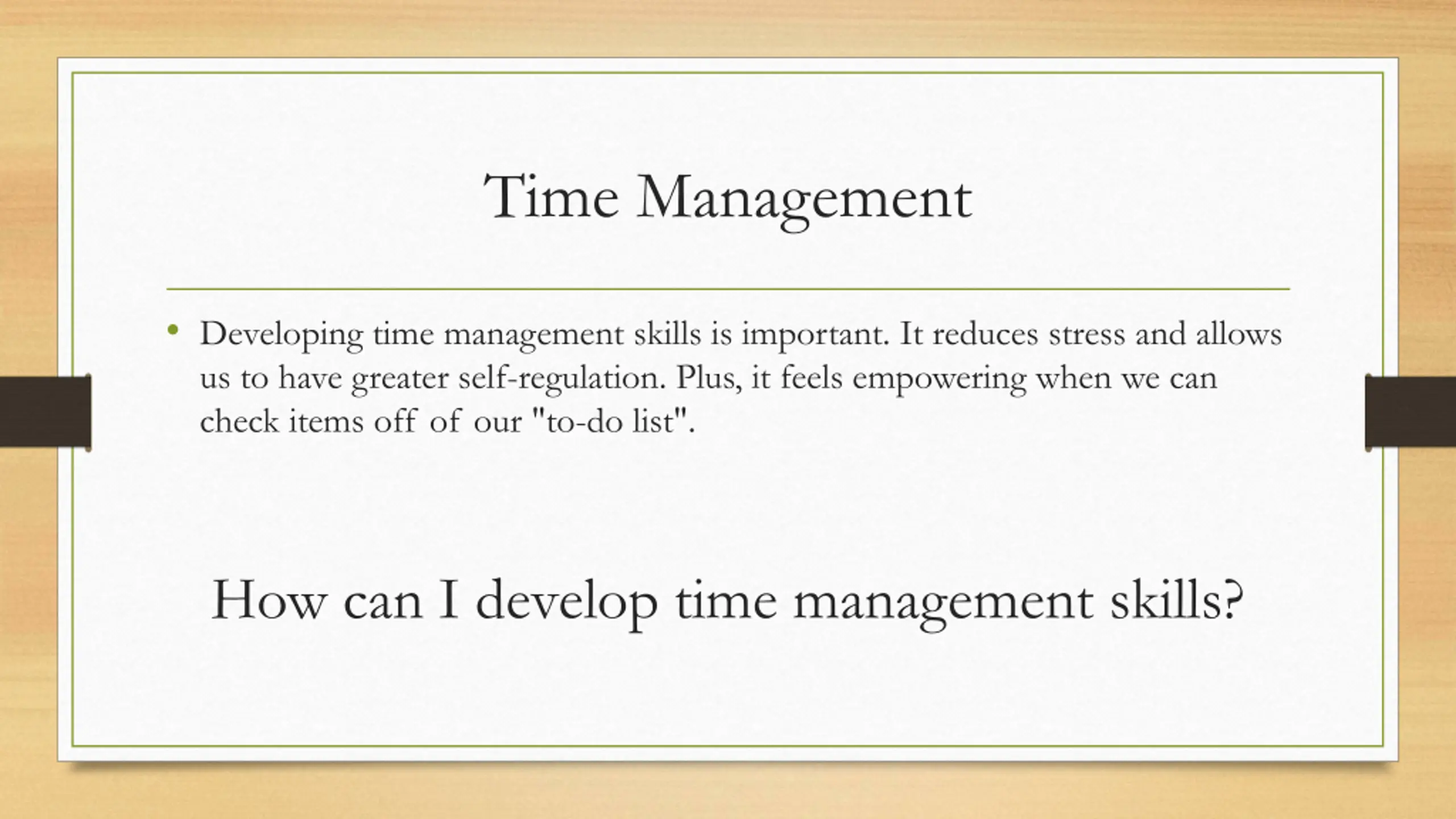 Time Management Developing time management skills is important. It reduces stress and allows us to have greater self-regulation. Plus, it feels empowering when we can check items off of our "to-do list". How can I develop time management skills?