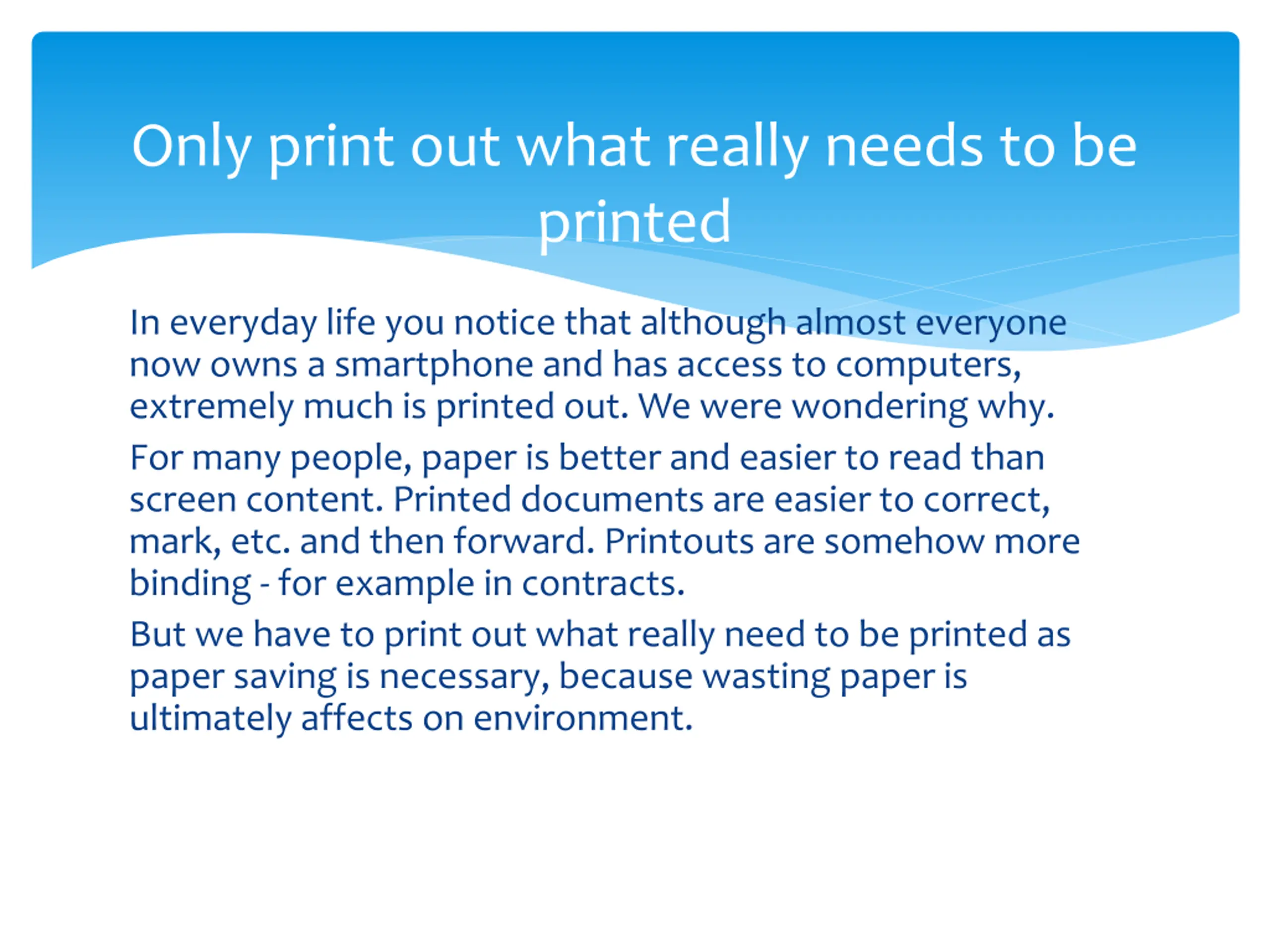 Only print out what really needs to be printed In everyday life you notice that although almost everyone now owns a smartphone and has access to computers, extremely much is printed out. We were wondering why. For many people, paper is better and easier to read than screen content. Printed documents are easier to correct, mark, etc. and then forward. Printouts are somehow more binding - for example in contracts. But we have to print out what really need to be printed as paper saving is necessary, because wasting paper is ultimately affects on environment.