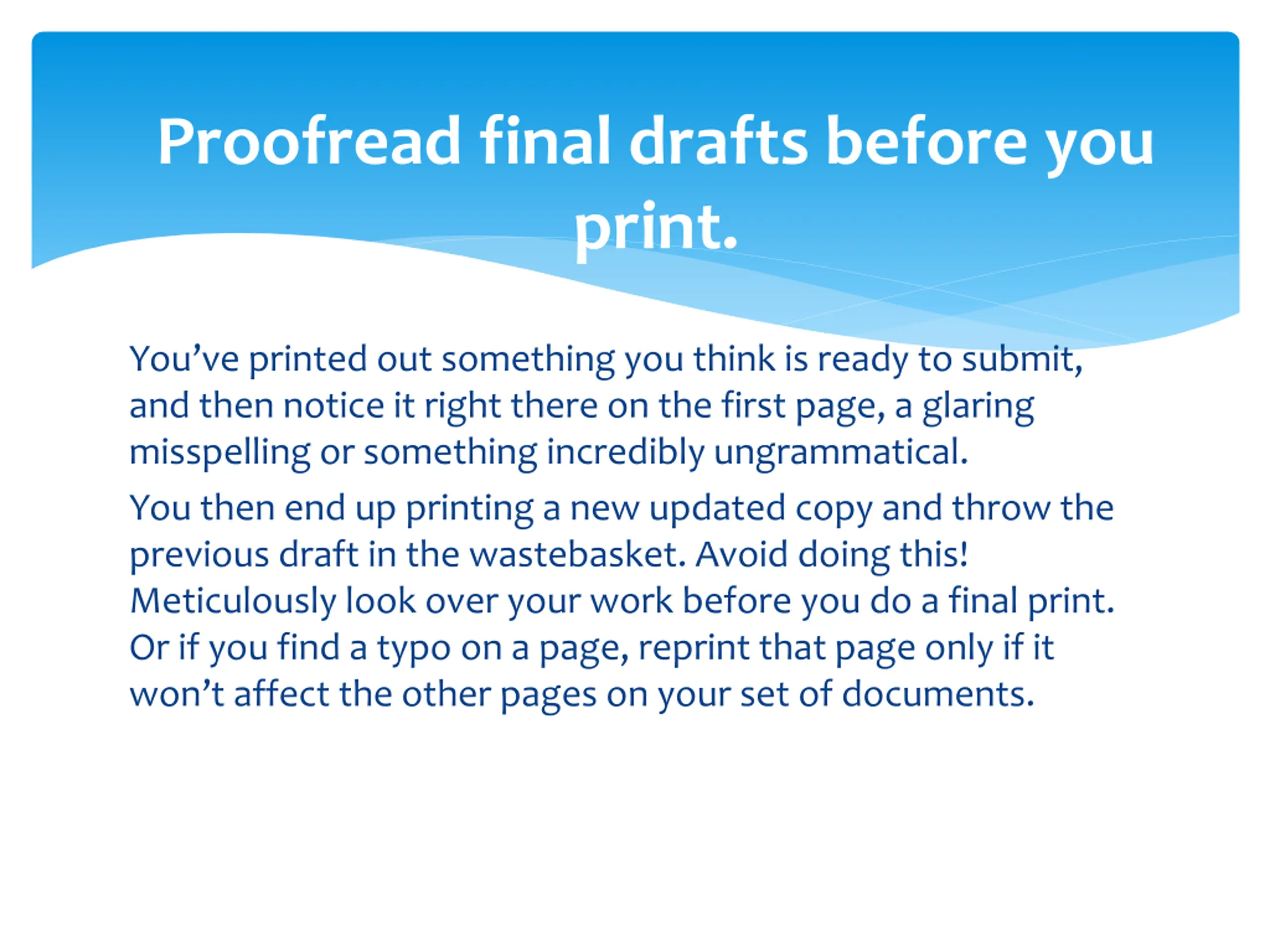 Proofread final drafts before you print. You ve printed out something you think is ready to submit, and then notice it right there on the first page, a glaring misspelling or something incredibly ungrammatical. You then end up printing a new updated copy and throw the previous draft in the wastebasket. Avoid doing this! Meticulously look over your work before you do a final print. Or if you find a typo on a page, reprint that page only if it won t affect the other pages on your set of documents.