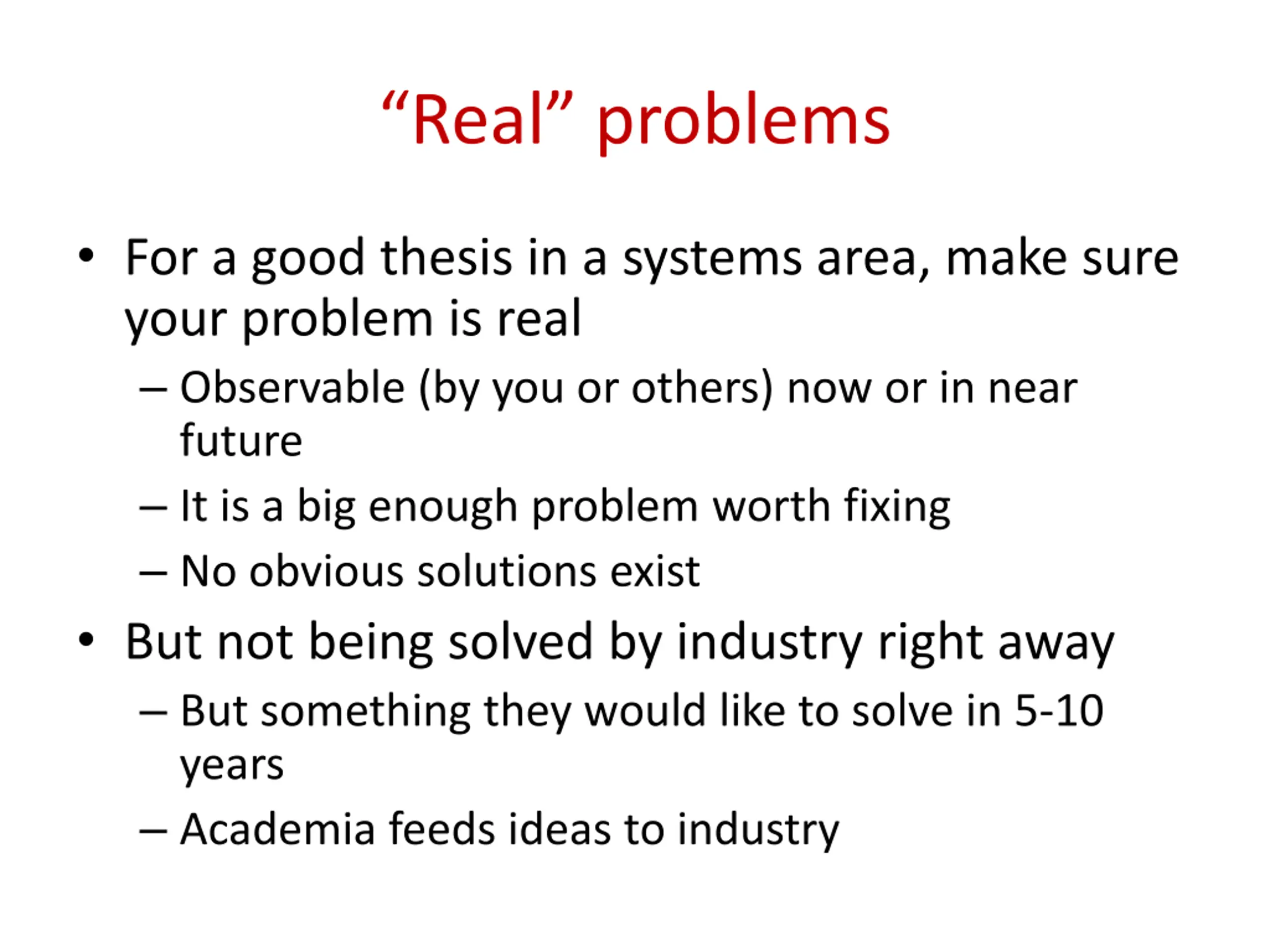 Real problems For a good thesis in a systems area, make sure your problem is real Observable (by you or others) now or in near future It is a big enough problem worth fixing No obvious solutions exist But not being solved by industry right away But something they would like to solve in 5-10 years Academia feeds ideas to industry