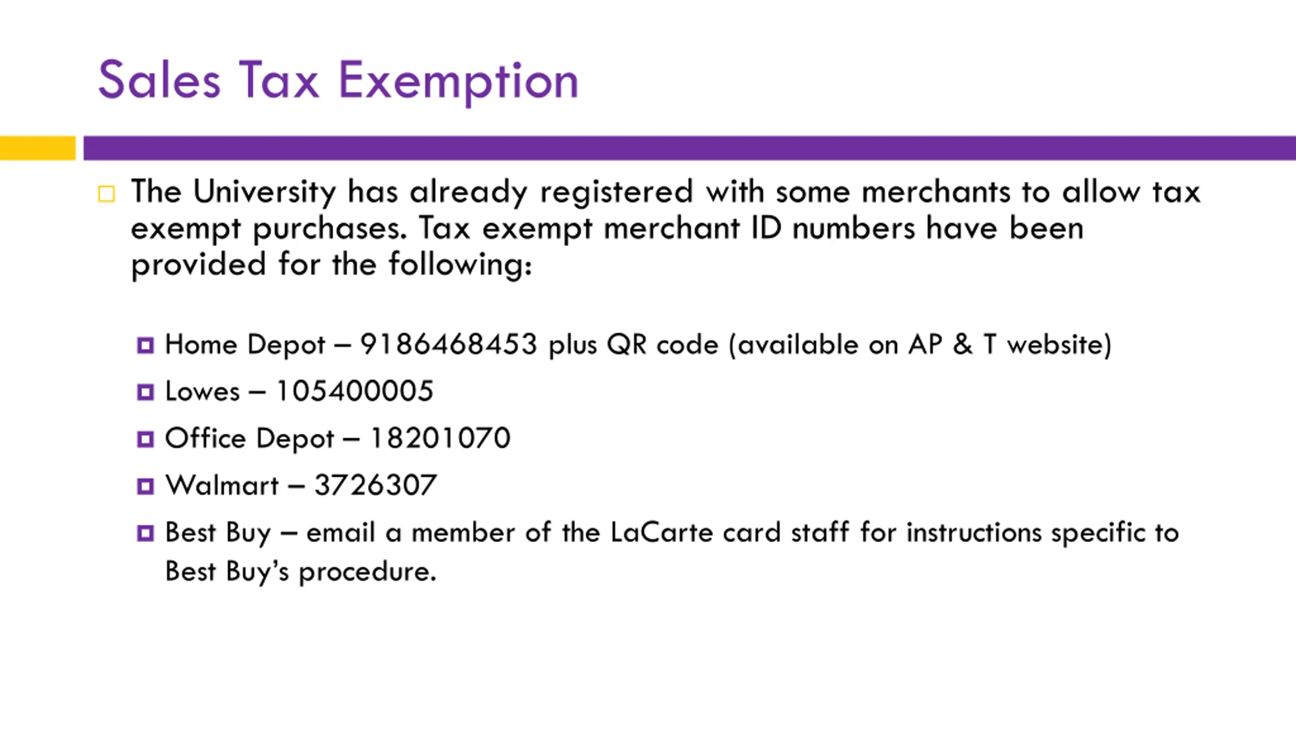 Sales Tax Exemption continued The University has already registered with some merchants to allow tax exempt purchases. Tax exempt merchant ID numbers have been provided for the following: Home Depot 9186468453 plus QR code (available on AP & T website) Lowes 105400005 Office Depot 18201070 Walmart 3726307 Best Buy email a member of the LaCarte card staff for instructions specific to Best Buy s procedure.