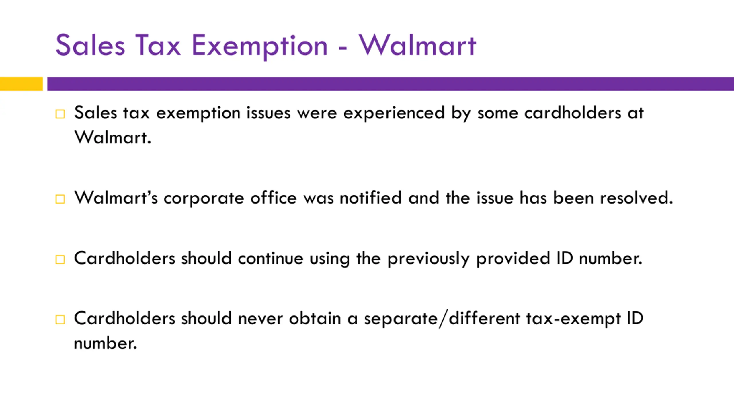 Sales Tax Exemption - Walmart Sales tax exemption issues were experienced by some cardholders at Walmart. Walmart s corporate office was notified and the issue has been resolved. Cardholders should continue using the previously provided ID number. Cardholders should never obtain a separate/different tax-exempt ID number.