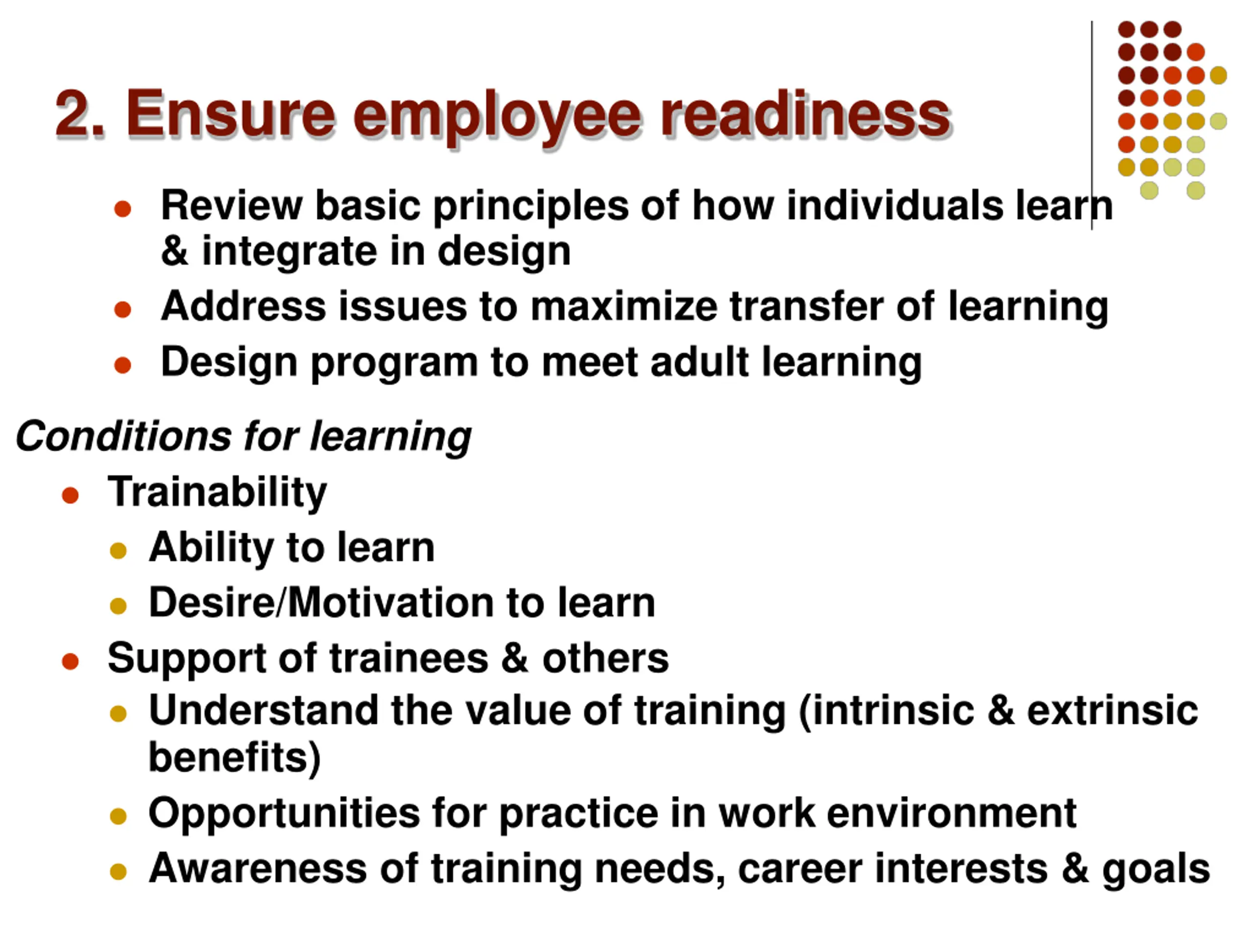 2. Ensure employee readiness Review basic principles of how individuals learn & integrate in design Address issues to maximize transfer of learning Design program to meet adult learning Conditions for learning Trainability Ability to learn Desire/Motivation to learn Support of trainees & others Understand the value of training (intrinsic & extrinsic benefits) Opportunities for practice in work environment Awareness of training needs, career interests & goals