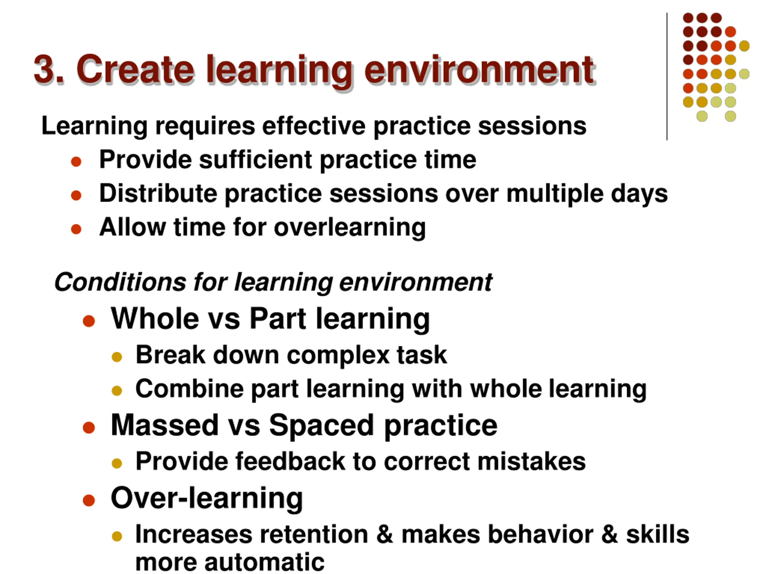 3. Create learning environment Learning requires effective practice sessions Provide sufficient practice time Distribute practice sessions over multiple days Allow time for overlearning Conditions for learning environment Whole vs Part learning Break down complex task Combine part learning with whole learning Massed vs Spaced practice Provide feedback to correct mistakes Over-learning Increases retention & makes behavior & skills more automatic