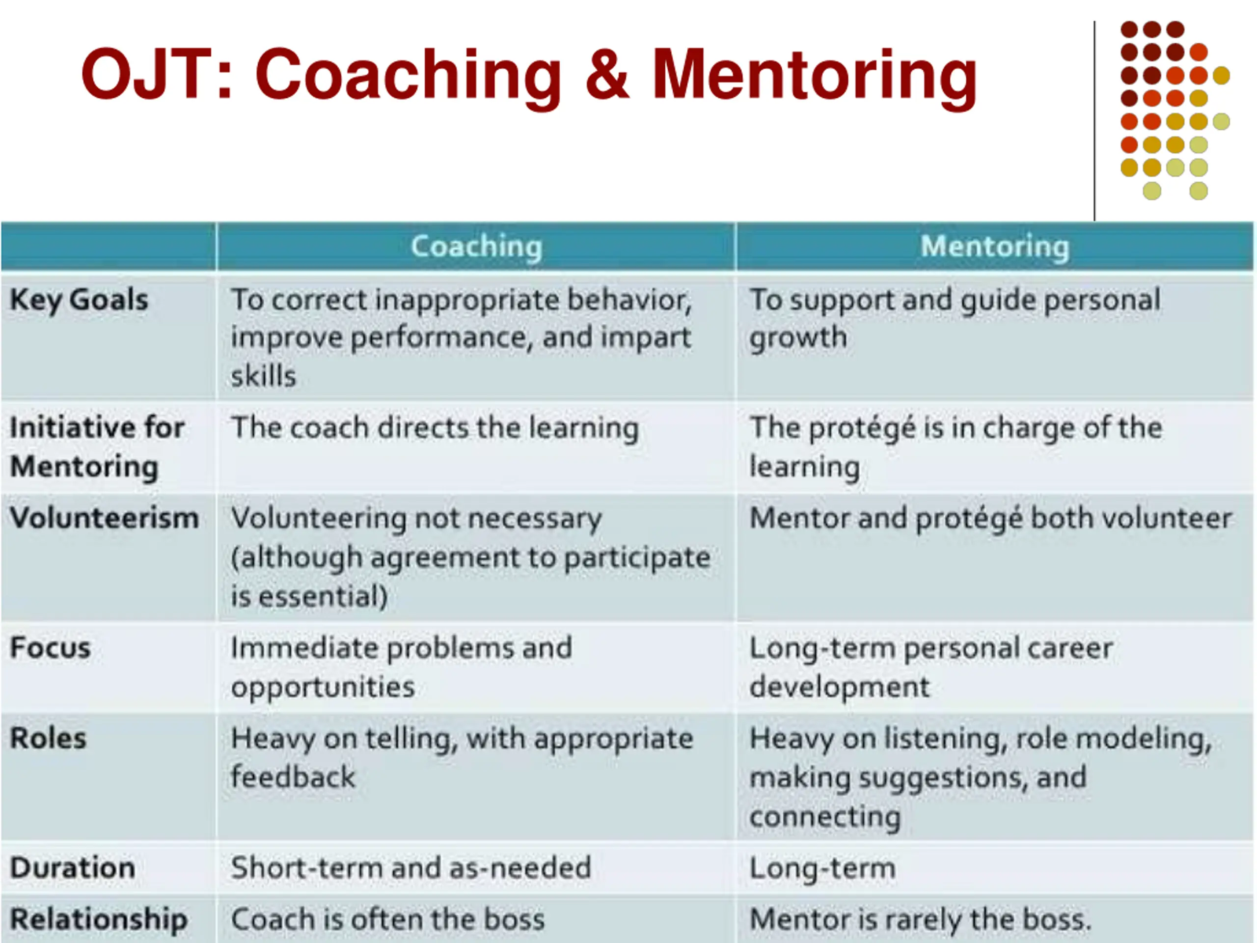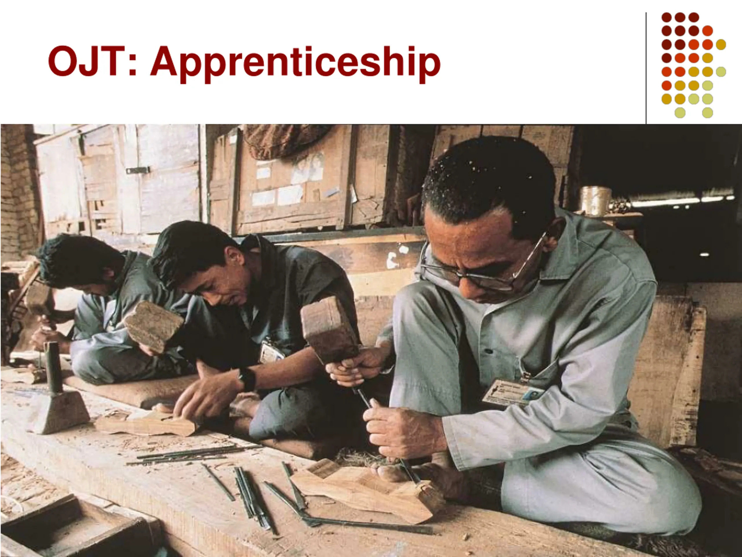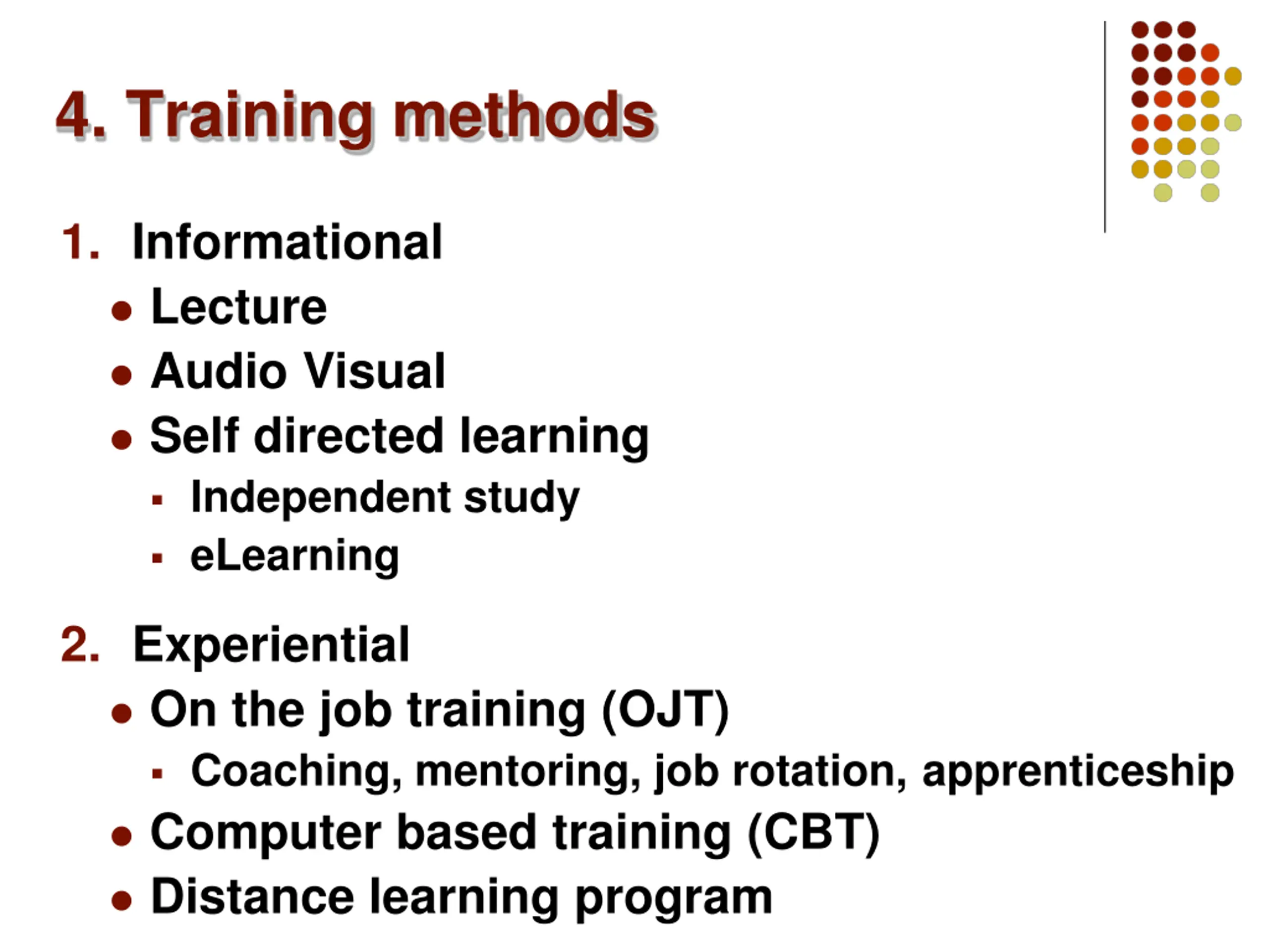 4. Training methods 1. Informational Lecture Audio Visual Self directed learning Independent study eLearning 2. Experiential On the job training (OJT) Coaching, mentoring, job rotation, apprenticeship Computer based training (CBT) Distance learning program