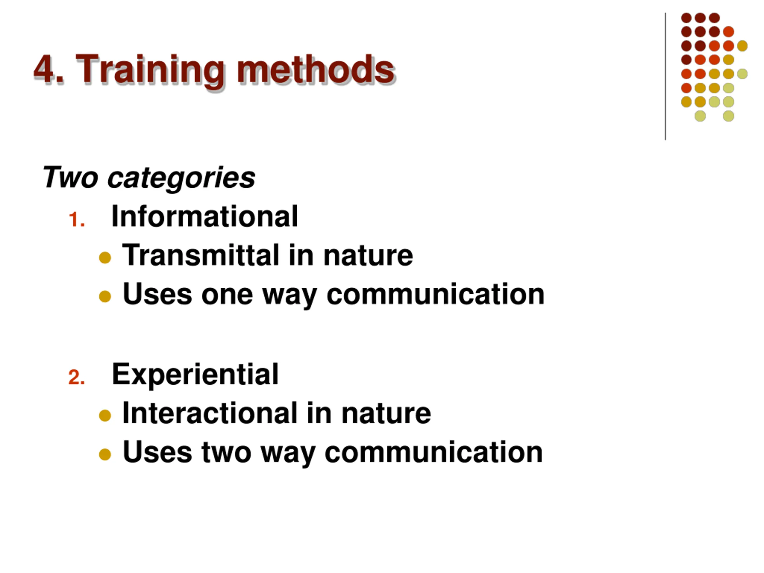 4. Training methods Two categories 1. Informational Transmittal in nature Uses one way communication 2. Experiential Interactional in nature Uses two way communication