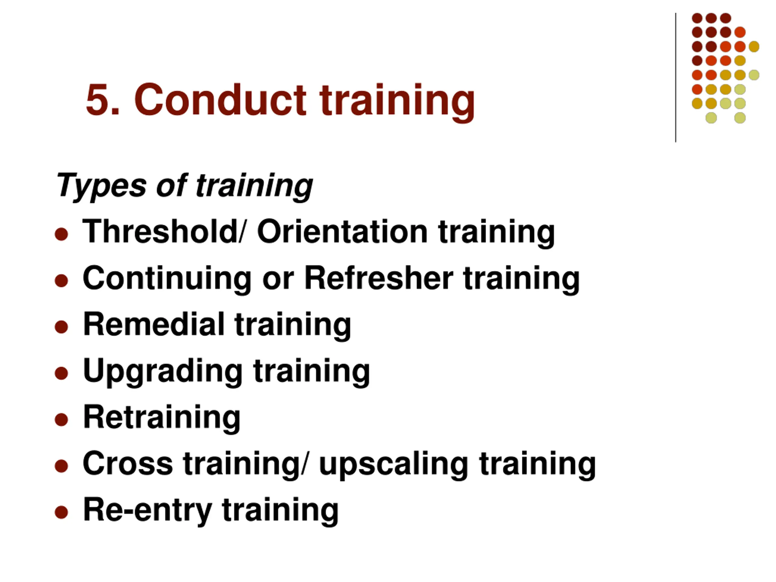 5. Conduct training Types of training Threshold/ Orientation training Continuing or Refresher training Remedial training Upgrading training Retraining Cross training/ upscaling training Re-entry training