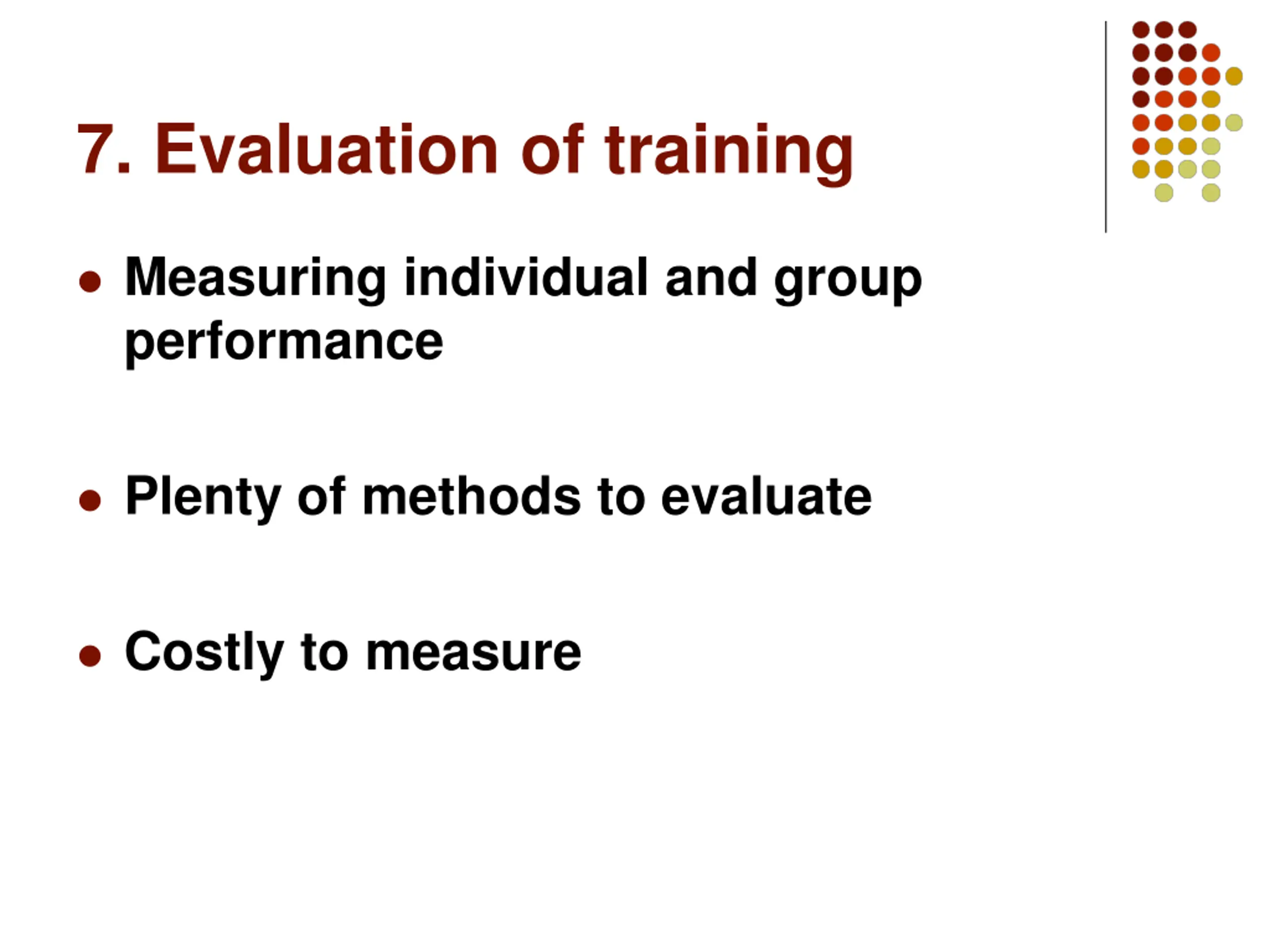 7. Evaluation of training Measuring individual and group performance Plenty of methods to evaluate Costly to measure