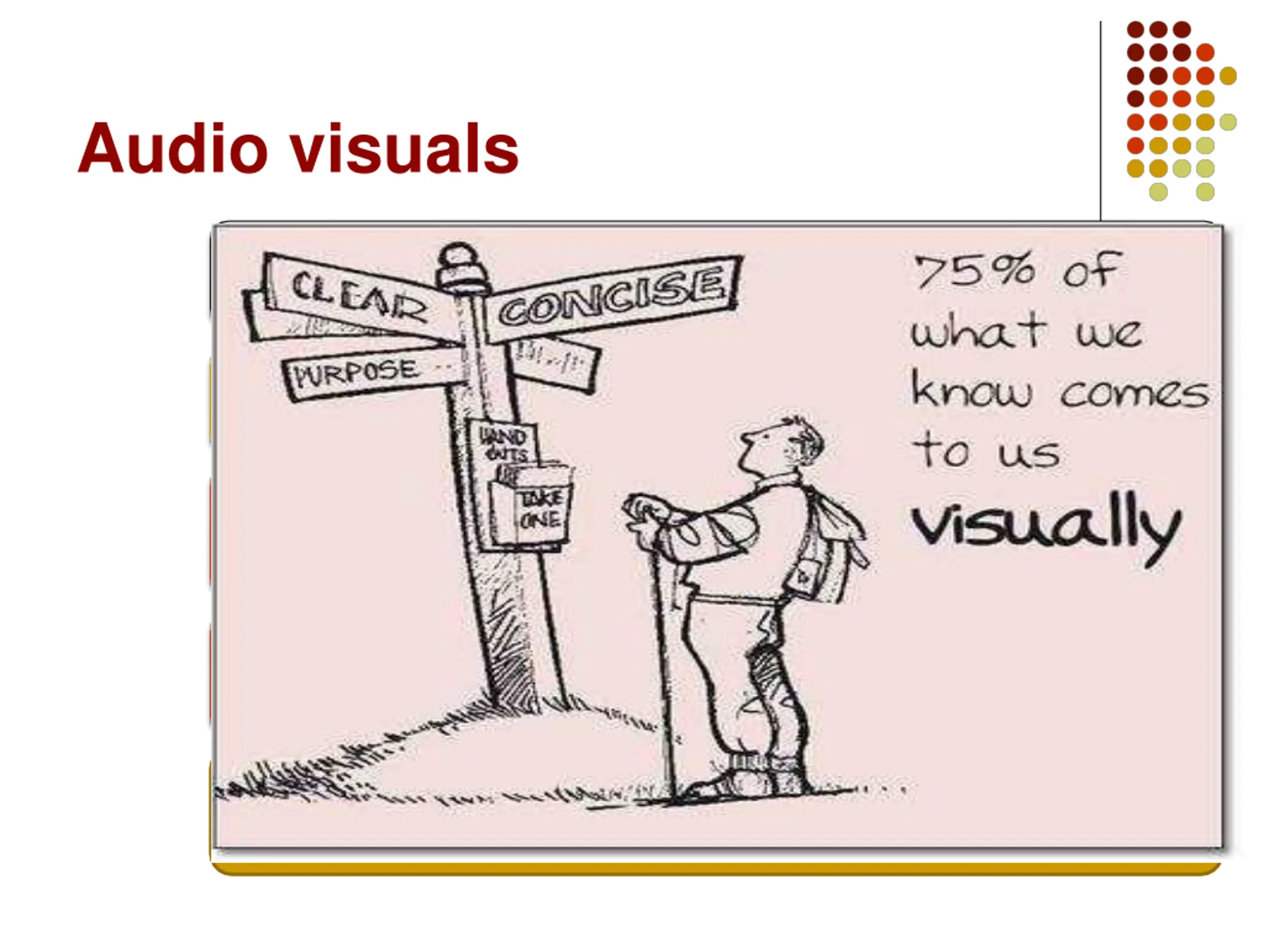 Audio visuals Effective mean of conducting training Boost moral Slides, movies, video clips, teletraining, video conferencing. Lots of training program with geographical dispersed population Allows for replay and lots of versatility in training.